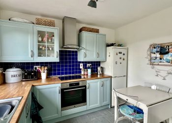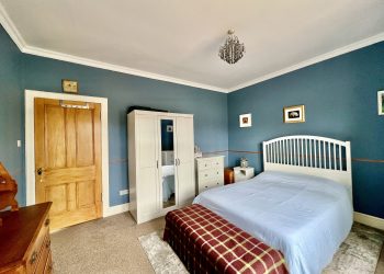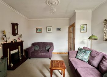 Stainless steel one and half bowl sink with mixer tap above and drainer to side. Integrated electric oven. Integrated electric hob with stainless steel chimney style extractor hood above. Space for washing machine. Radiator. Large uPVC double glazed picture window overlooking the rear and catching views of Kirkcudbright’s bustling Harbour. Carbon monoxide alarm. Vinyl tiled flooring.