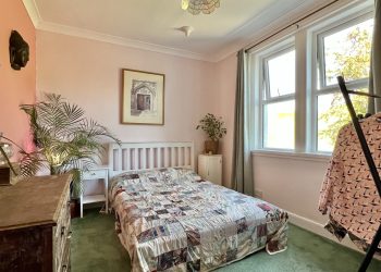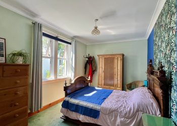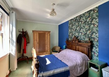 Enjoying a pleasant outlook across the rear garden with two generous uPVC double glazed windows with curtain poles and curtains above. Ceiling light. Ceiling cornicing. Radiator. Fitted Carpet.