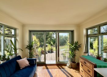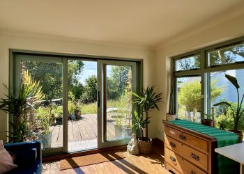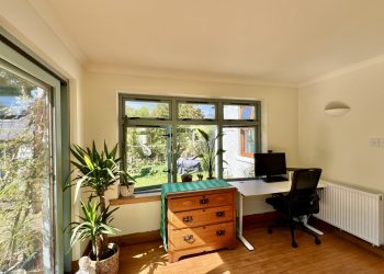 Delightful garden room enjoying a pleasant outlook across the decking and down to the main garden area. Hardwood double glazed windows on both walls providing an abundance of light and wrap round view of garden. Hardwood double glazed doors leading to extensive decking. Two wall uplighters. Solid wooden floor.
