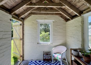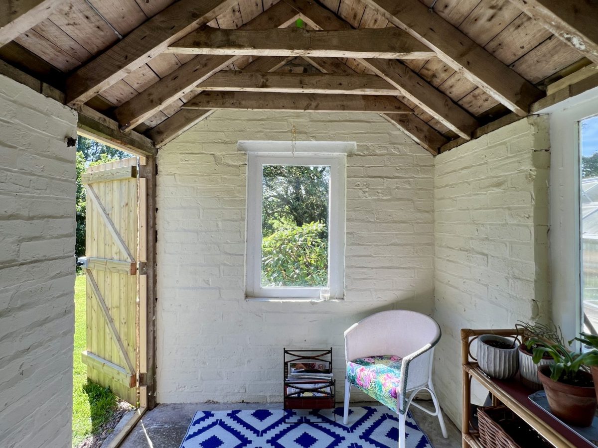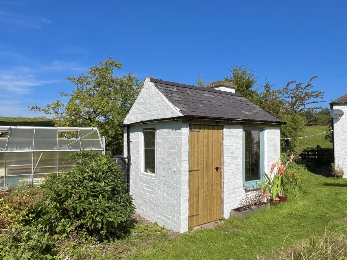 Attractive brick outbuilding/former wash house with pitched slated roof. Three single glazed windows. Pedestrian door. Concrete floor.
