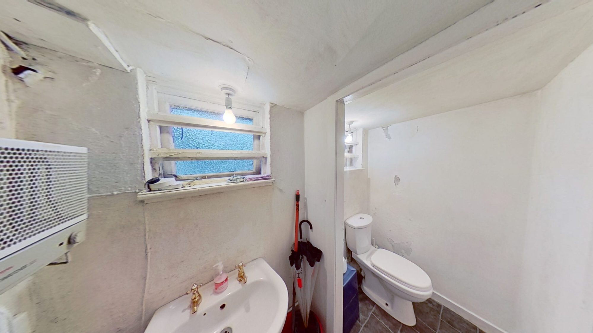 Vinyl floor. Ceiling light. White W.C. and wash hand basin. Electric wall heater. Obscure glazed window.