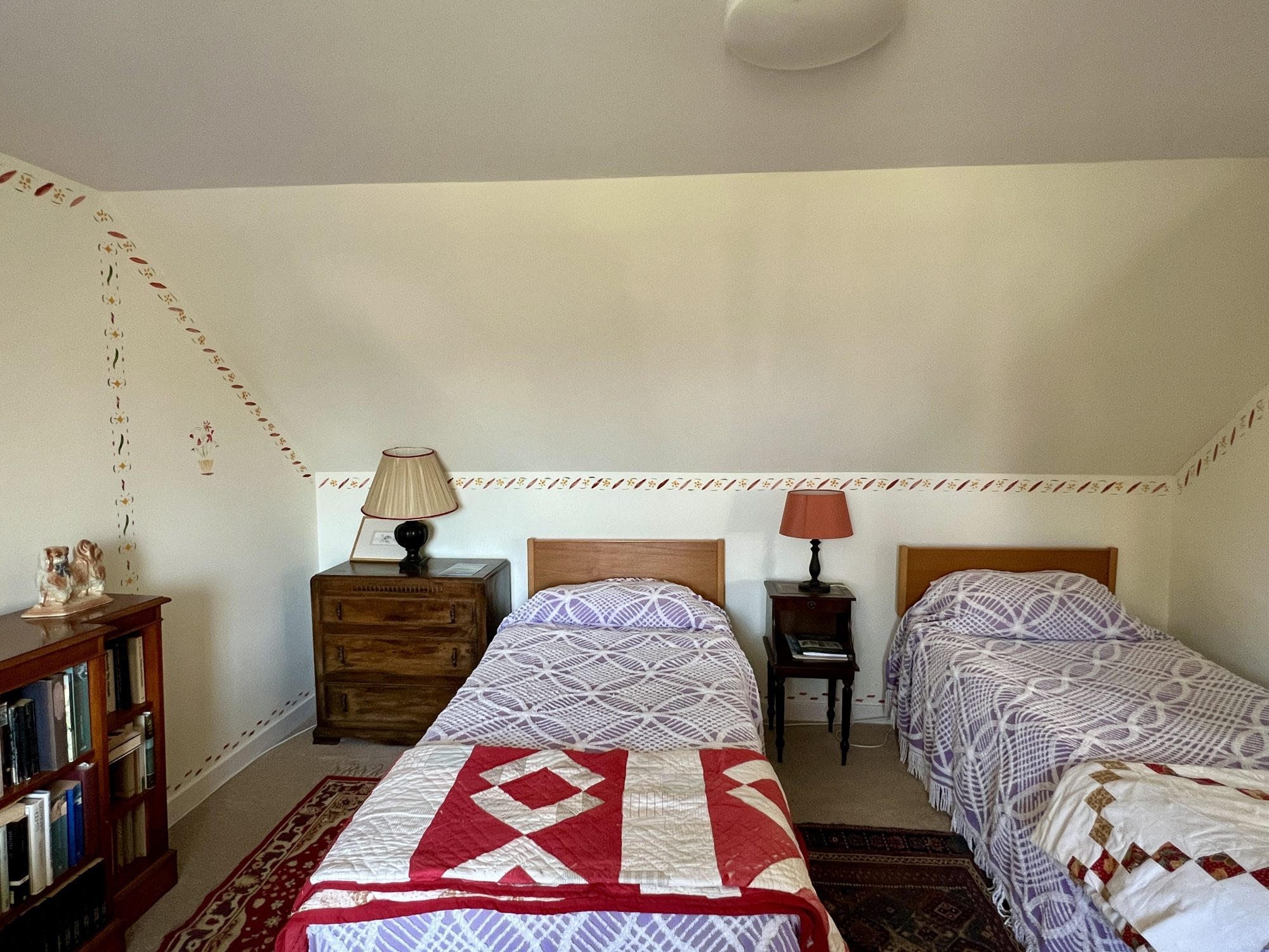 Currently used as a guest bedroom but would equally be well suited as a home office or craft room. Wooden glazed window to side overlooking garden with roller blind above. Wooden glazed door leading out to garden. Radiator. Wall light and ceiling light. Door leading to W.C. Velux window. Large walk-in cupboard with hanging rail and shelving. Partially coombed ceiling. Vinyl flooring.