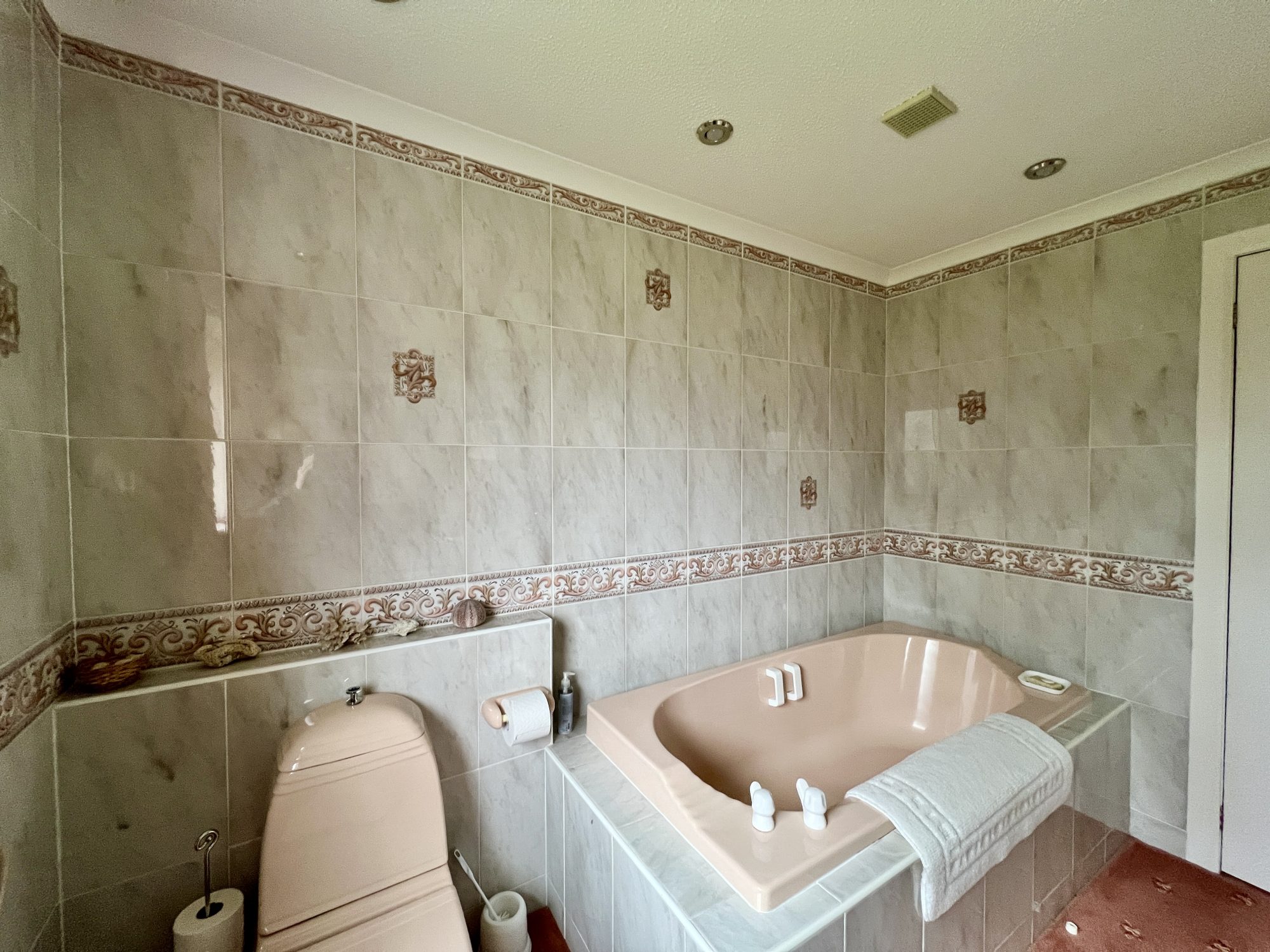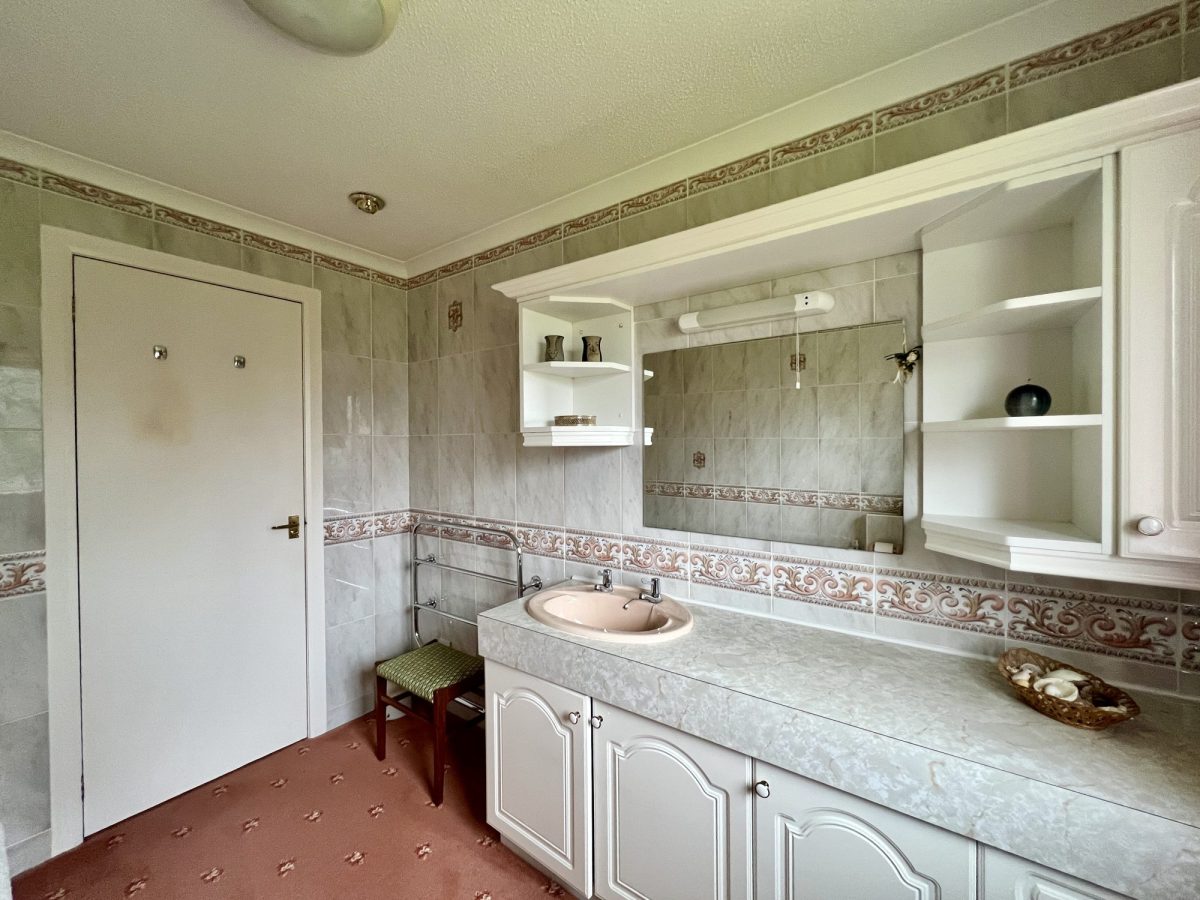 Coloured suite of bath and WC. Washhand basin inset into vanity unit with laminate work surfaces and built-in storage beneath. Tiled from floor to ceiling. Radiator. Wall-mounted bathroom cabinets. Razor light. Fixed bathroom mirror. Chrome heated towel rail. Recessed halogen spotlights. Obscure uPVC double glazed window with curtain track and curtains. Fitted carpet.