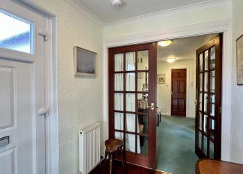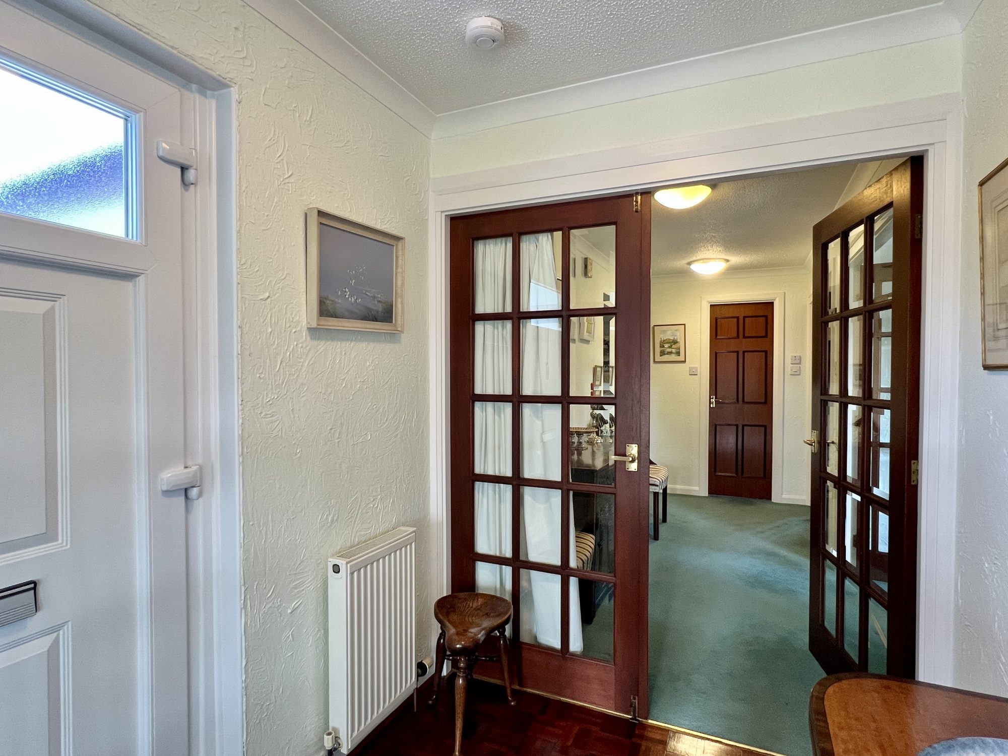 Wide L-shaped reception hallway with doors leading off to all main accommodation. 2 Ceiling lights. Ceiling cornicing. Storage cupboard. Central heating thermostat. access hatch. Radiator. Fitted carpet. Two wooden 15-pane glazed doors leading into:-