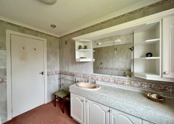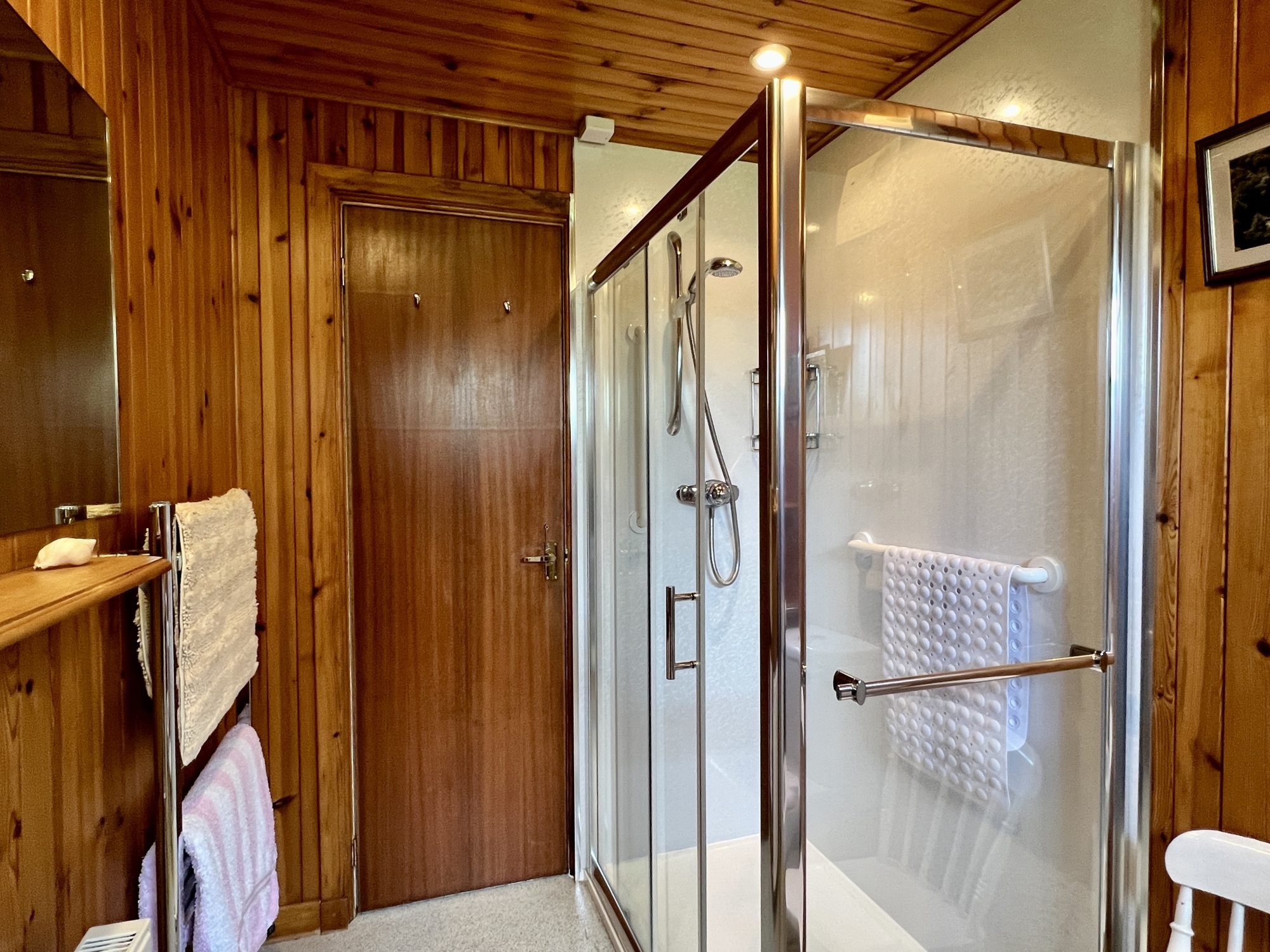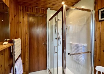 Good sized shower room with large walk-in shower cubicle with mains shower. Wood paneling on all walls. Recessed LED ceiling spotlights. Dimplex wall-mounted fan heater. uPVC obscure glazed window. Shaving light. Fixed bathroom mirror. Built-in vanity unit providing useful additional storage with inset wash hand basin with mixer tap. Radiator. Vinyl anti-slip flooring.