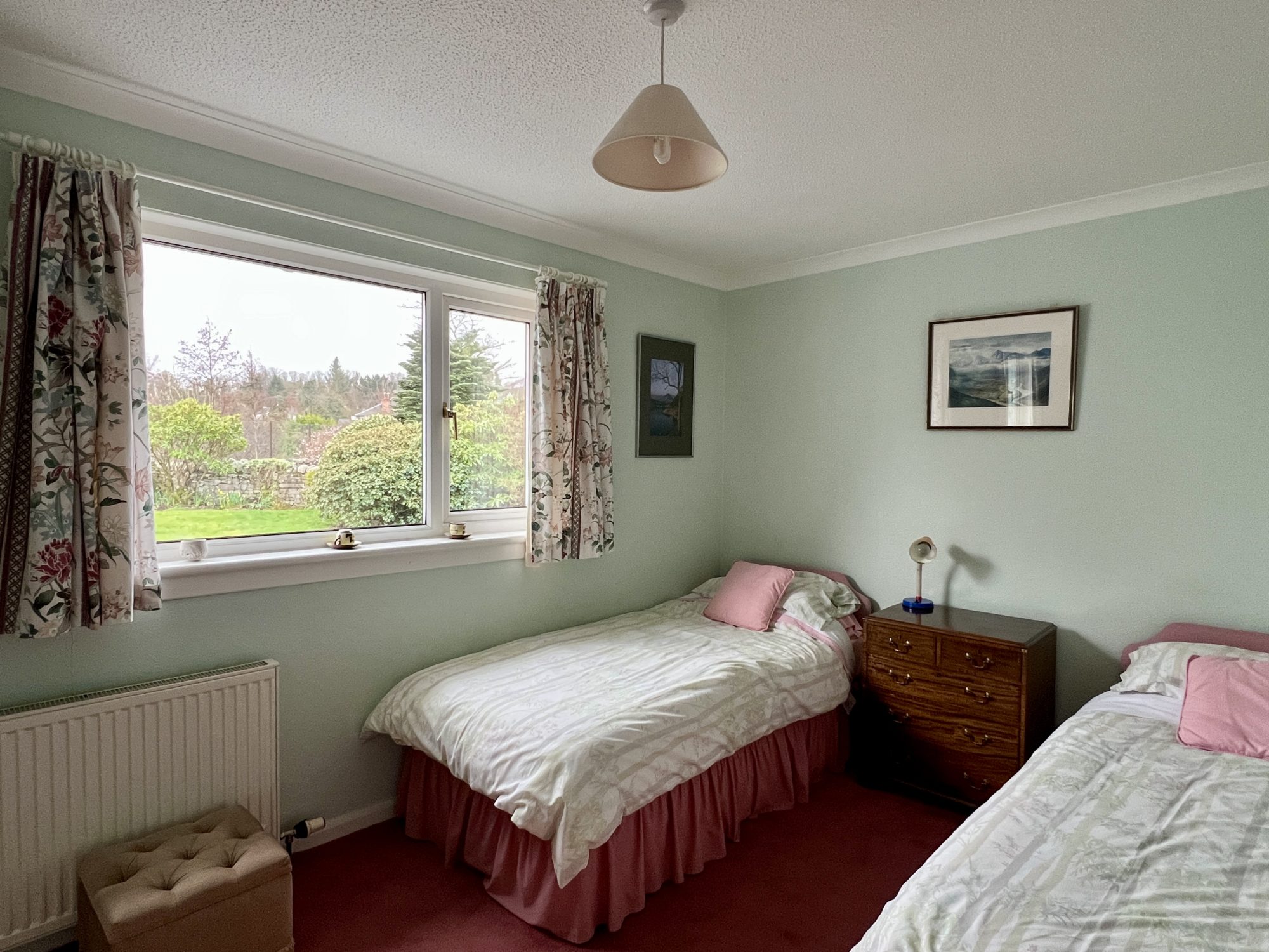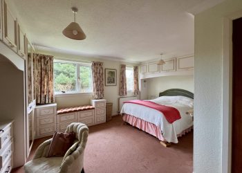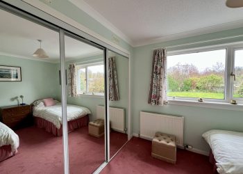 The largest of the three double bedrooms, enjoys a fine outlook across the garden and ample natural light from two uPVC double glazed picture windows with curtain pole and curtains above. Ceiling cornicing. Ceiling light. Radiator. Two fitted double wardrobes with built in dressing table area. Additional storage above bed. Radiator. Fitted Carpet.