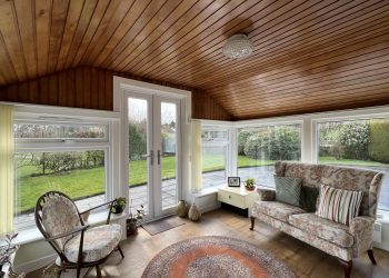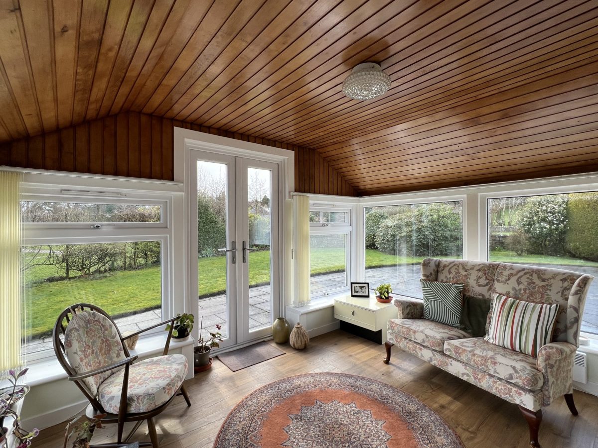 Well positioned conservatory which can be used all year round. uPVC double glazed windows on three walls. Pine-clad ceiling. uPVC double glazed French doors leading out down steps to generous patio area. Blinds. Ceiling light. Wood-effect flooring.