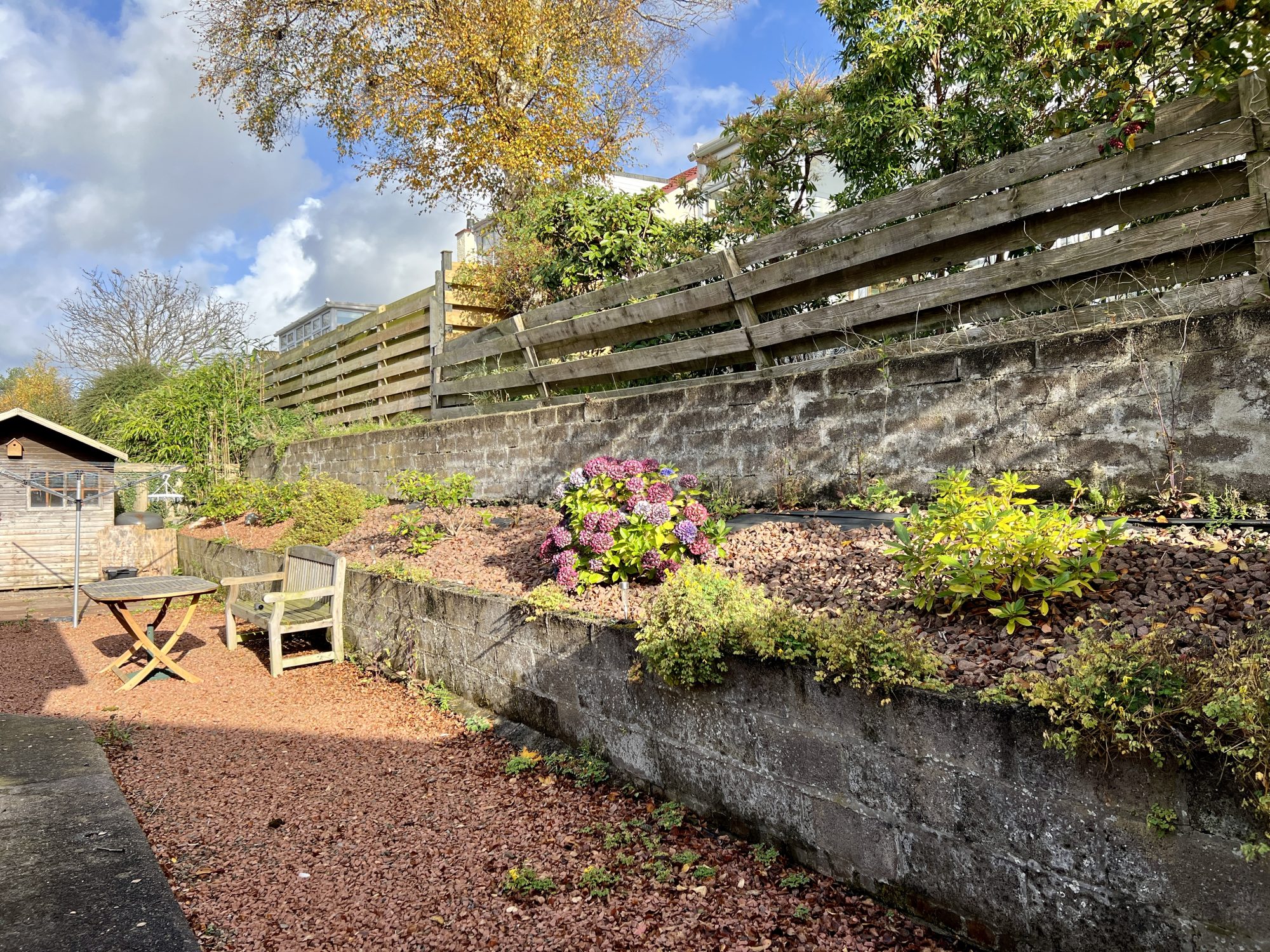 Mainly laid to gravel and paving for ease of maintenance. Paved path leads round to rear garden and back door.