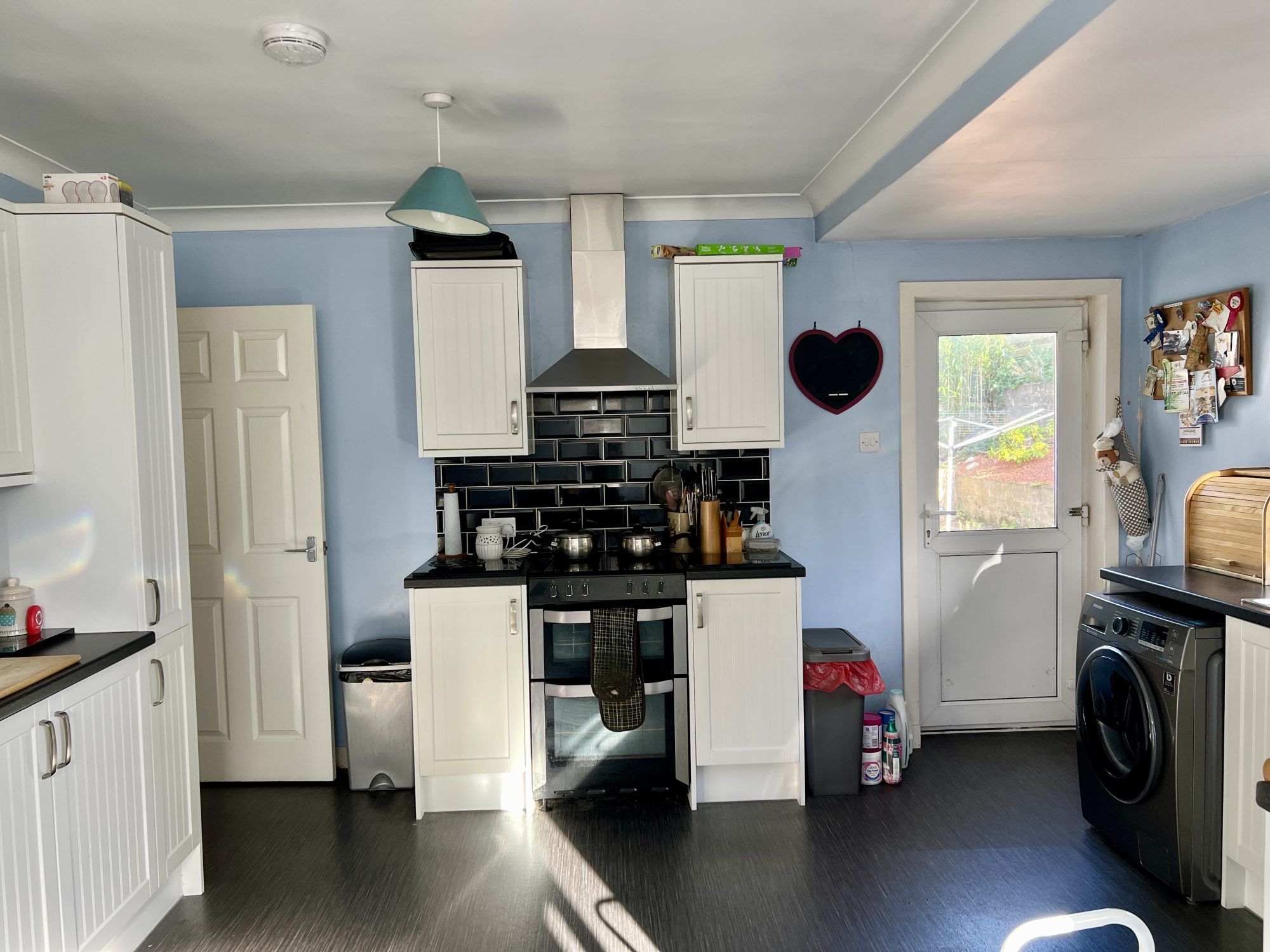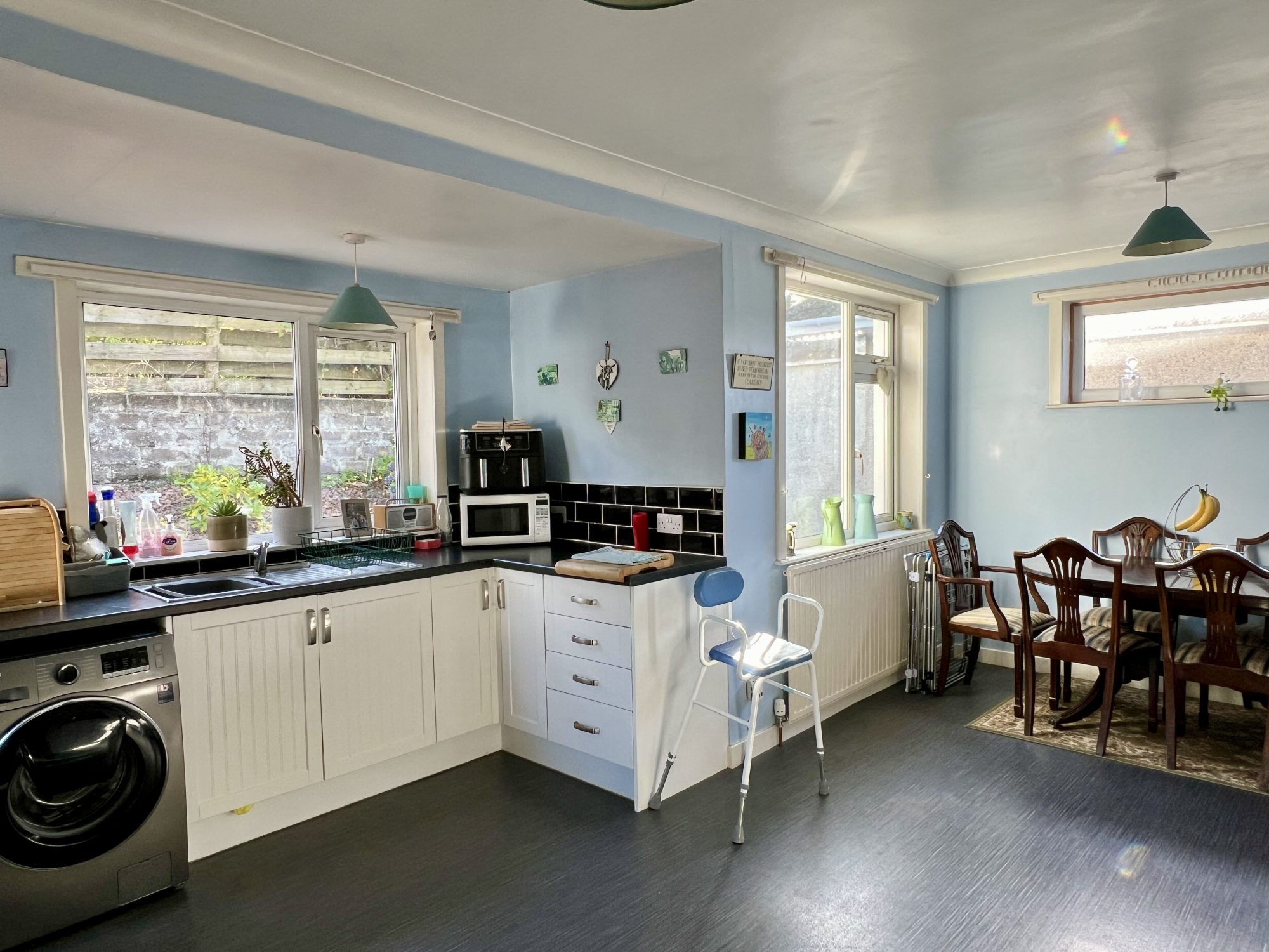 Bright spacious open plan dining kitchen with a good range of white fitted kitchen units. Laminate work surfaces. Stainless steel sink with mixer tap and drainer to side. Tiled splashbacks. Space for freestanding electric cooker. Plumbing for washing machine. uPVC double glazed window to rear. uPVC double glazed door leading out to rear garden. Good sized dining area with uPVC double glazed window to rear and panoramic window to side. Radiator. Ceiling lights. Vinyl floor.
