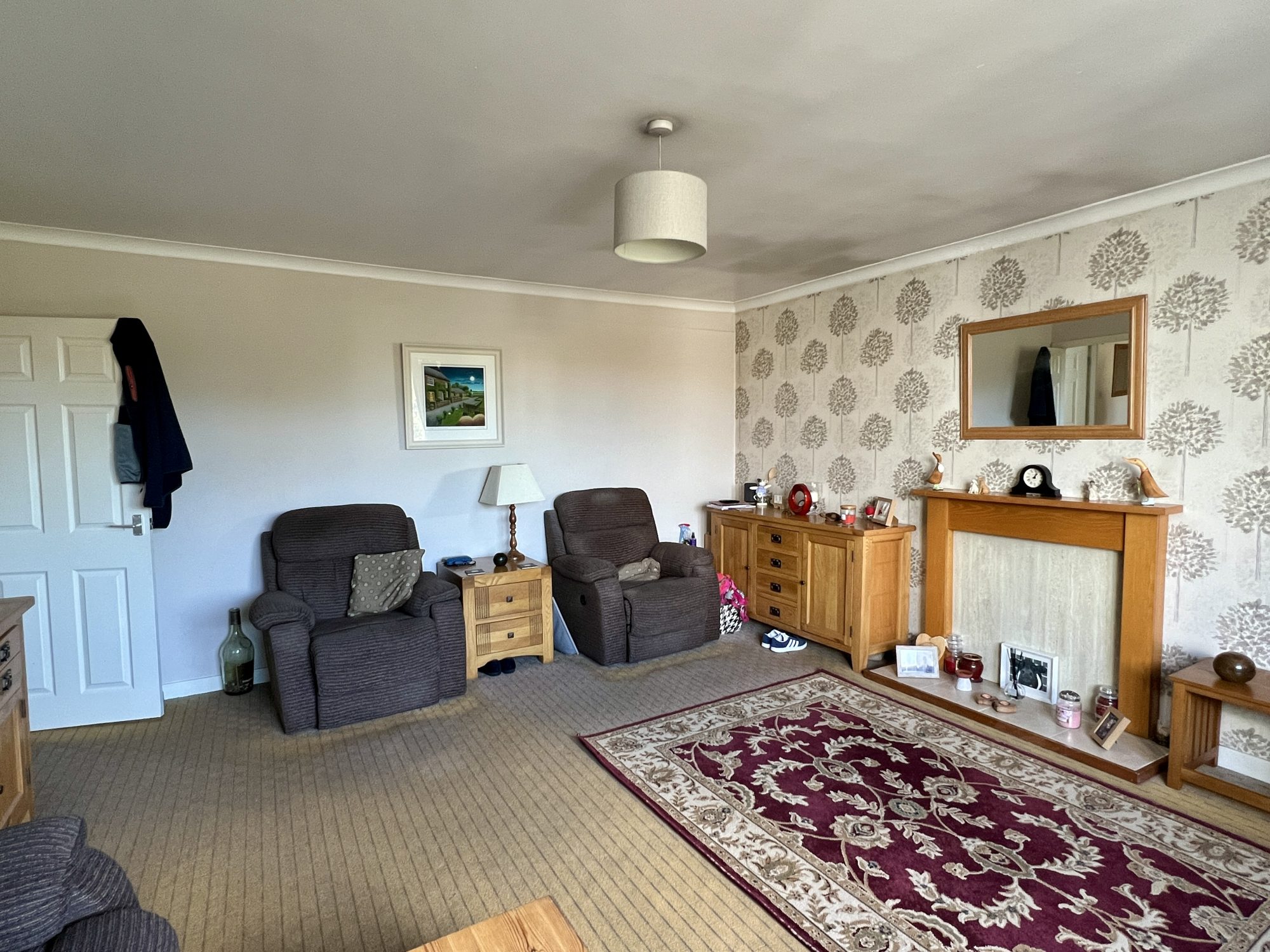 Bright spacious hallway with doors leading off to all main ground floor accommodation. Understair storage cupboard. Ceiling light. Smoke alarm. Radiator with thermostatic valve. Carpet. Carpeted staircase leading to first floor level.