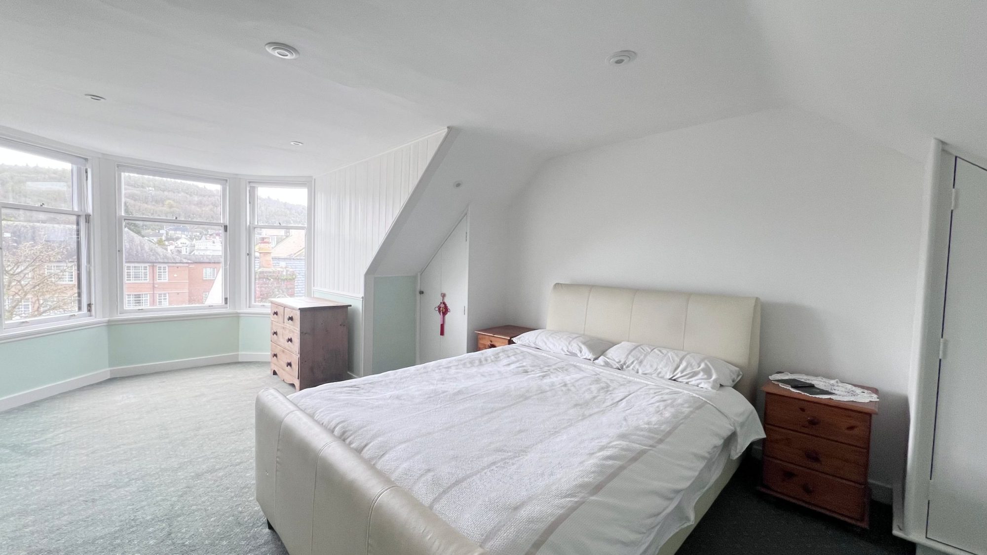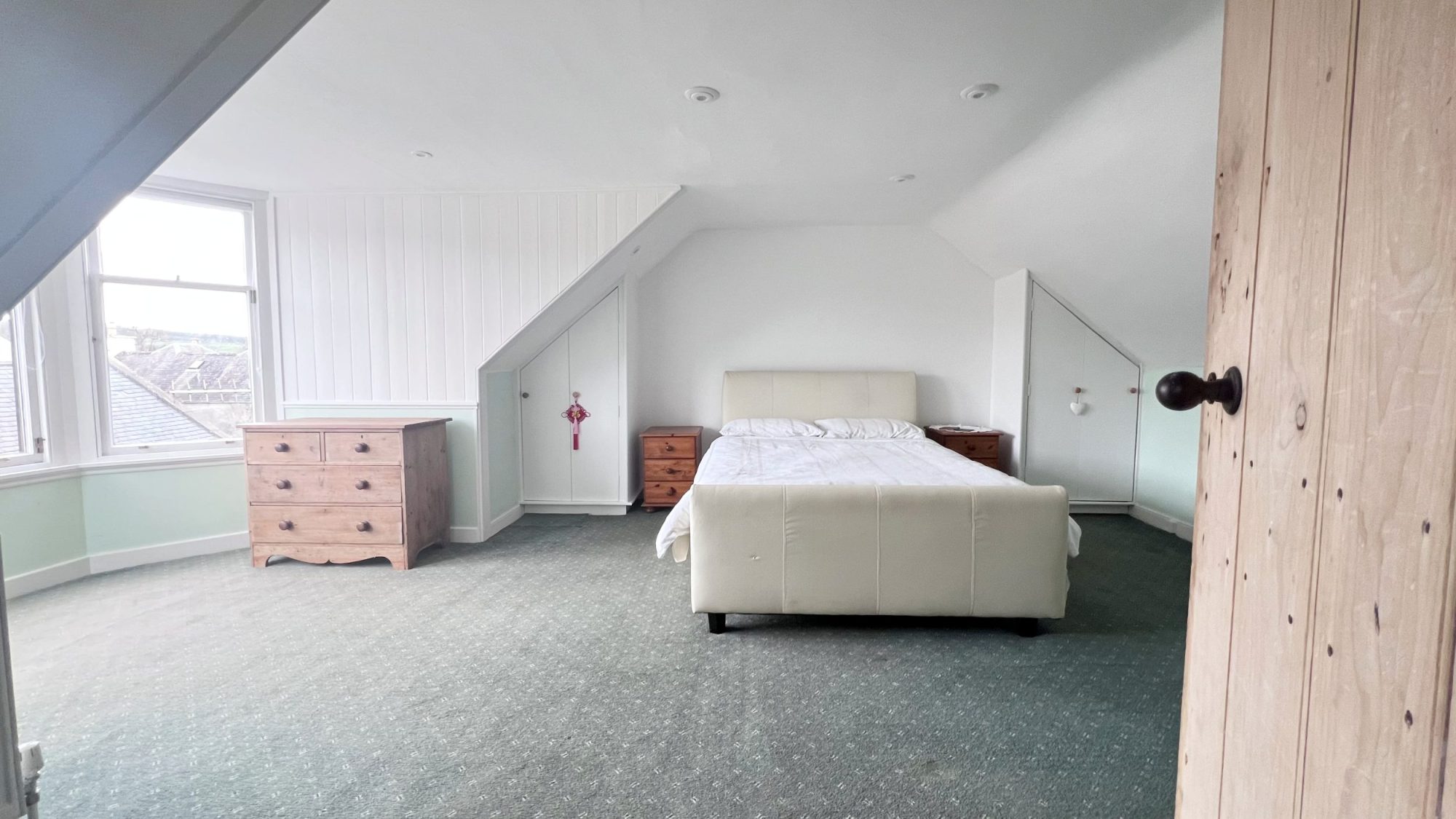 Bright and spacious master with an abundance of natural light from the large bay dormer window overlooking the gardens to the rear. Built in cupboards with shelving providing useful additional storage. Radiator with thermostatic valve. Partially coombed ceiling.