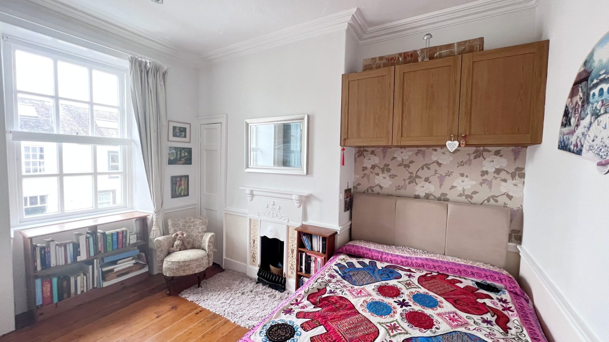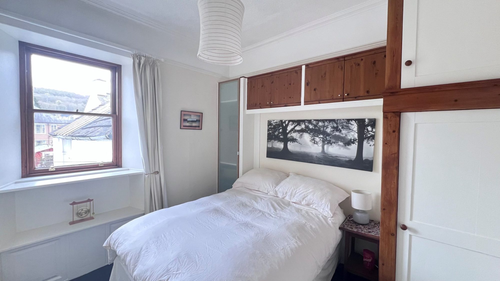 Bright, spacious front facing double bedroom. Sash and case window looking onto Castle Street with roller blind, curtain pole and curtains. Built in cupboard with shelving. Original feature fireplace with painted mantle and tiled surround. Built in wall cupboards. Radiator with thermostatic valve. Dado rail. Ceiling cornicing. Ceiling spotlight. Ceiling rose. Original varnished floorboards.