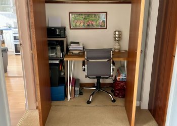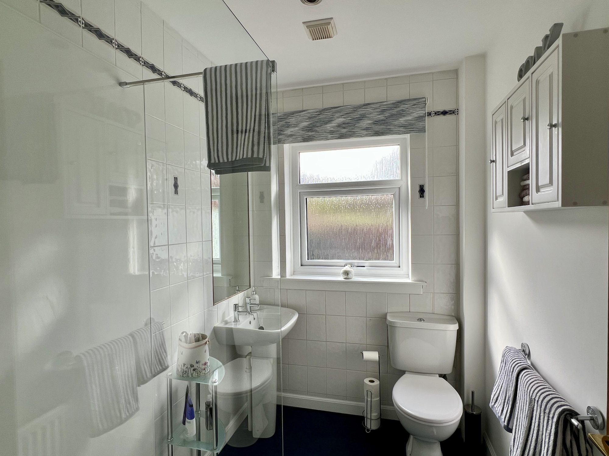 Generous shower room with large walk in double shower cubicle with Mira “Jump” electric shower above. Suite of white wash hand basin and W.C. uPVC obscure glazed window to rear with roller blind above. Tiled from floor to ceiling. Extractor fan. Fixed bathroom mirror. Wall mounted bathroom cabinet. Radiator. Recessed LED ceiling spotlights. Vinyl anti slip flooring.