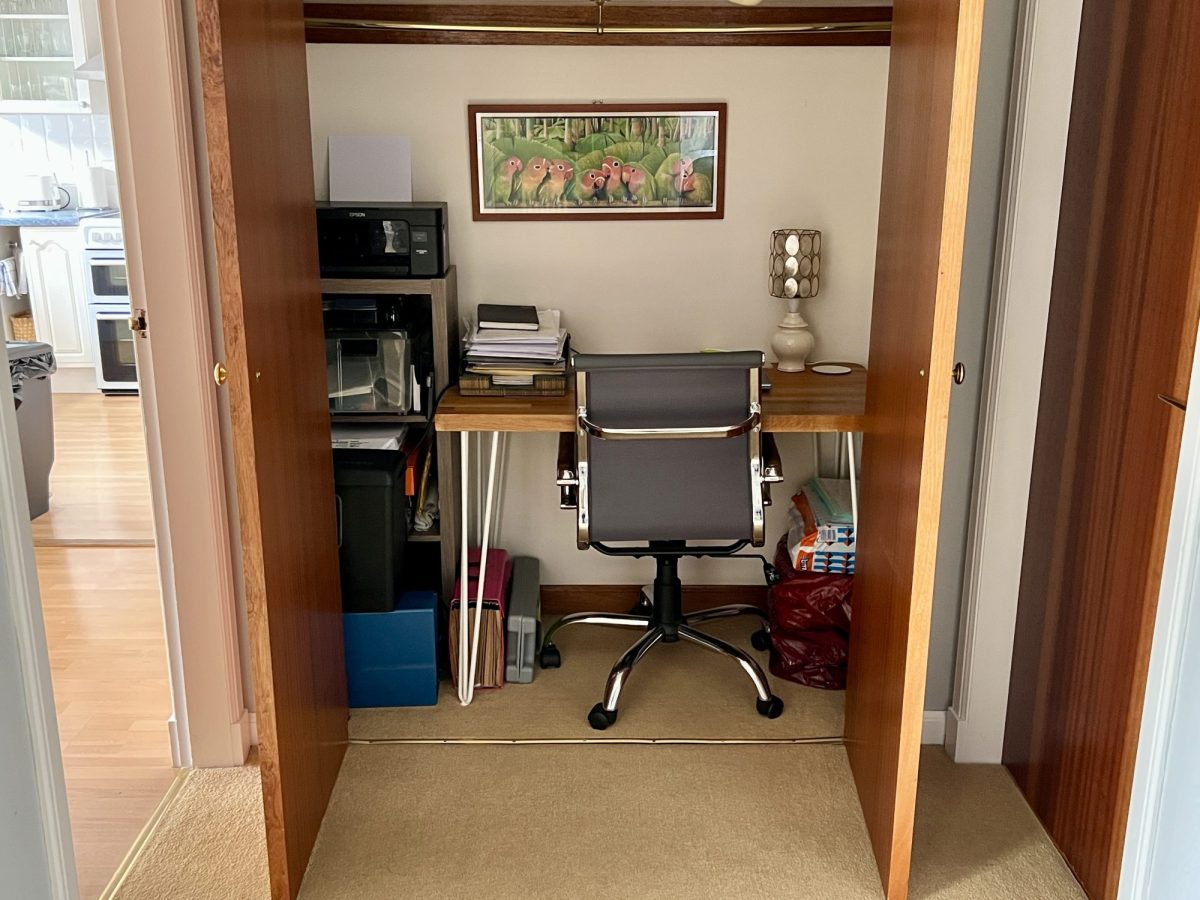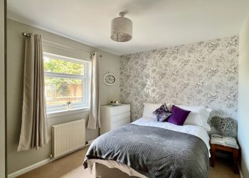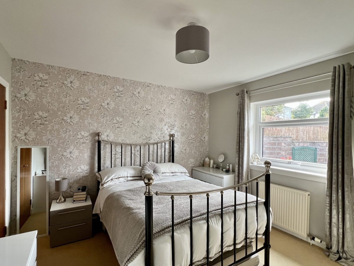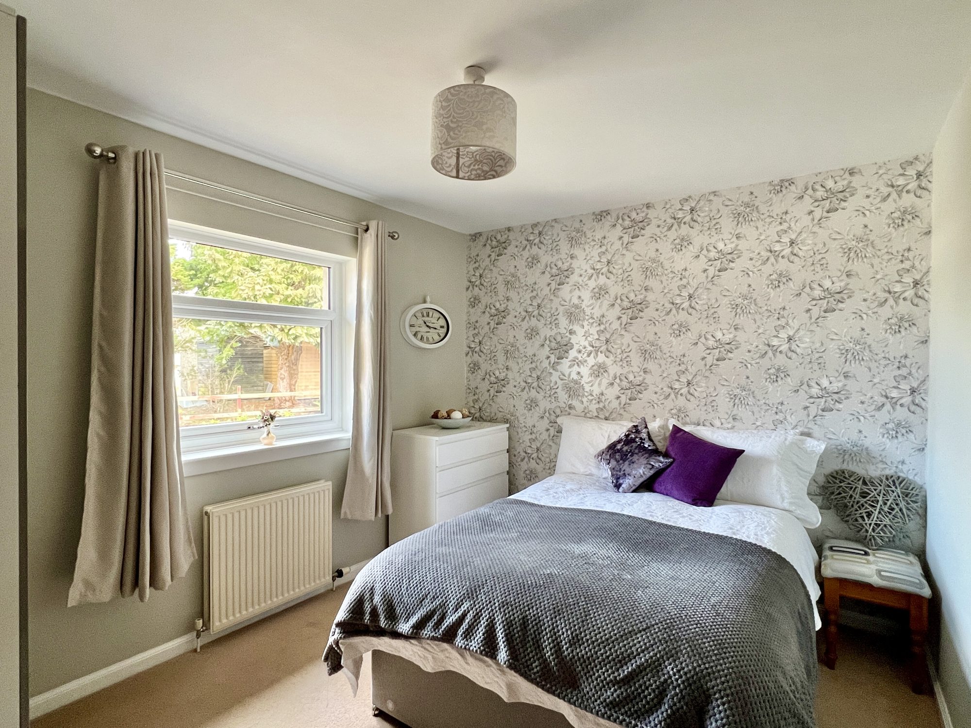 Further bright and airy double bedroom enjoying a pleasant outlook across the garden. Large uPVC double glazed picture window with curtain pole and curtains above. Radiator. Built in double wardrobe with hanging rail and shelving above providing useful additional storage. Ceiling light. Fitted carpet.