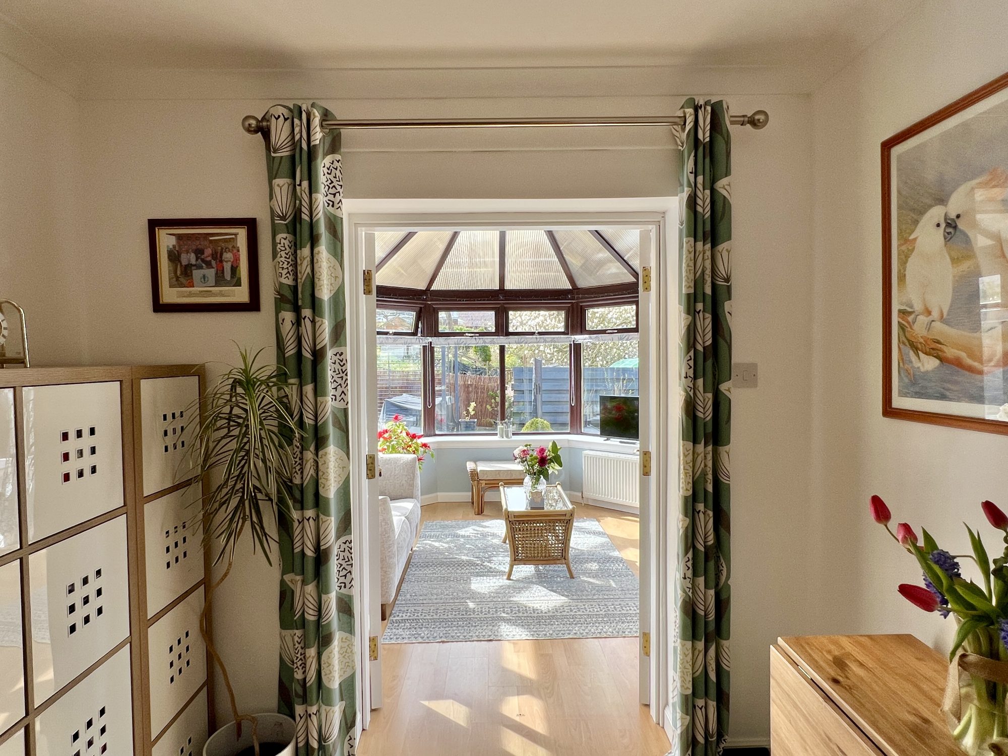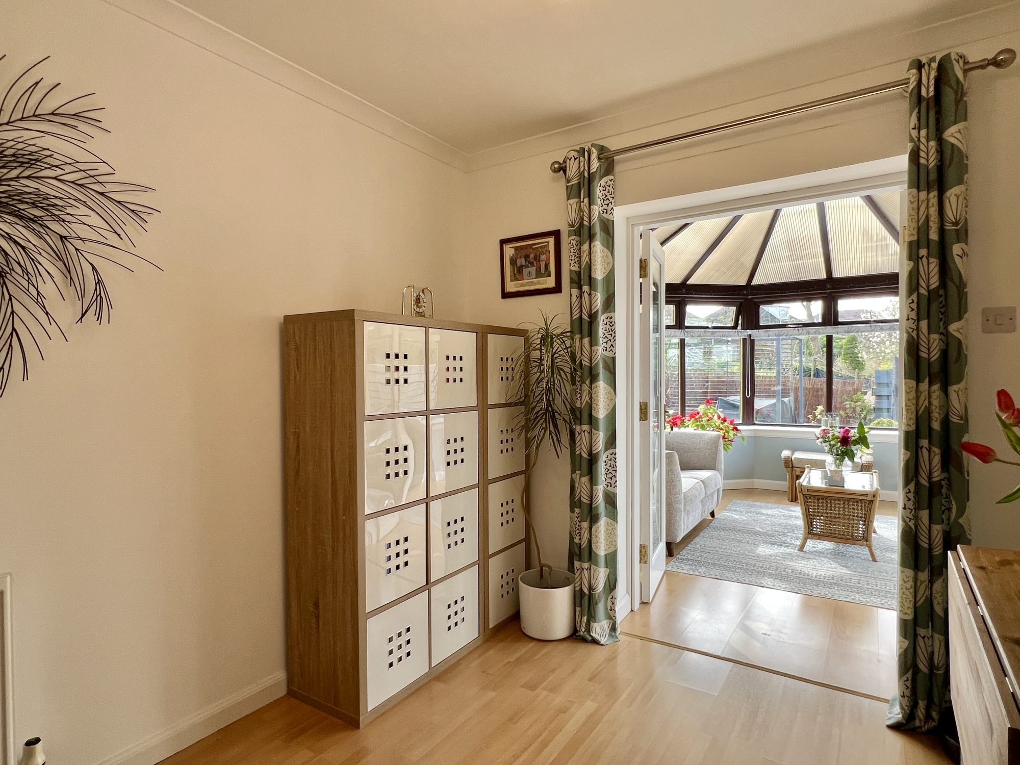 This useful area has previously been used as a dining room but could also be used as an informal reception room which links the reception hallway, conservatory and kitchen areas. Wooden French doors leading into conservatory. Curtain pole and curtains above. Archway to side leading through to kitchen. Radiator. Ceiling cornicing. Ceiling light. Wood effect laminate flooring.