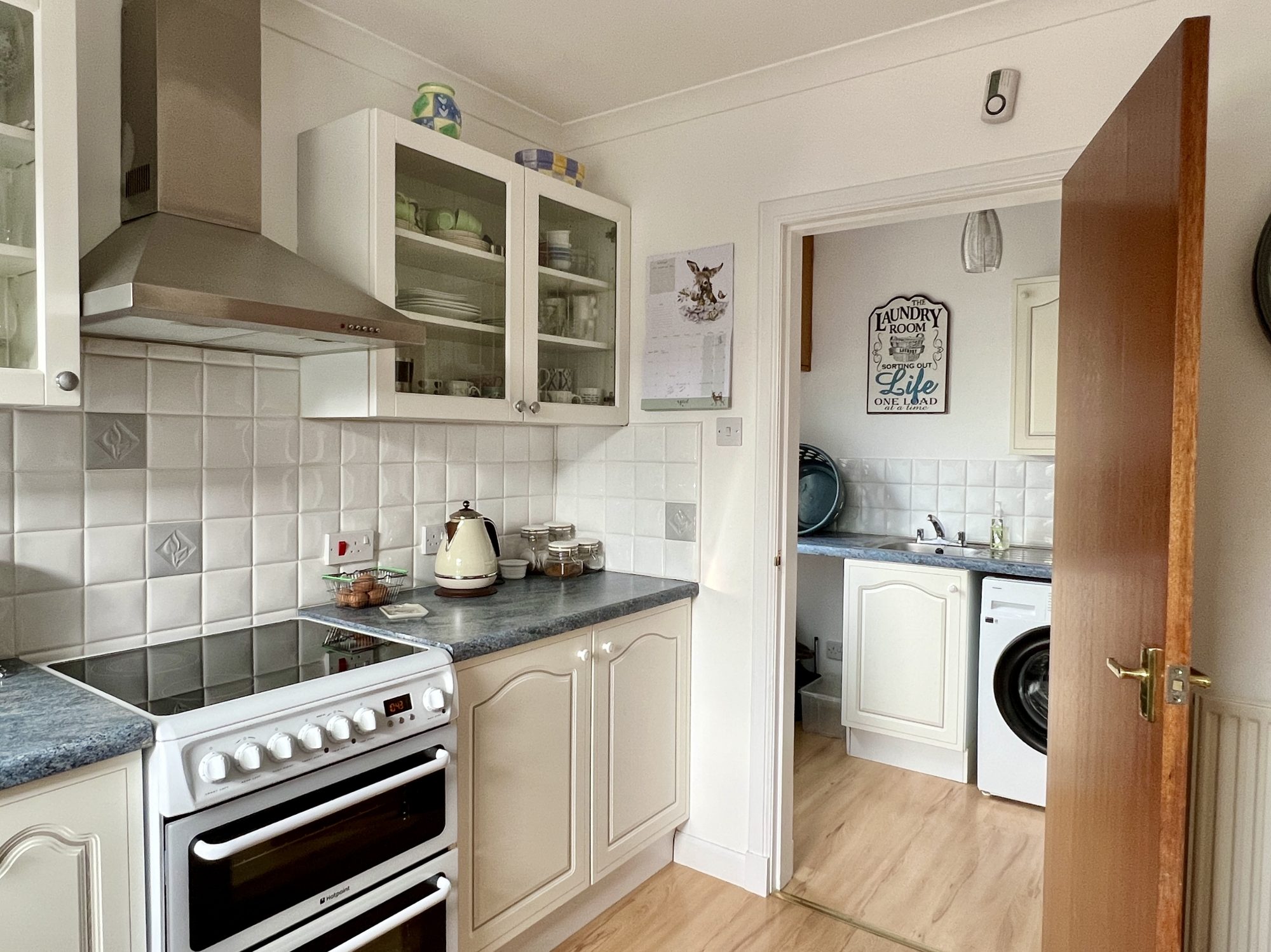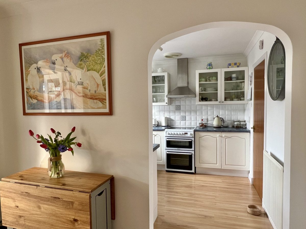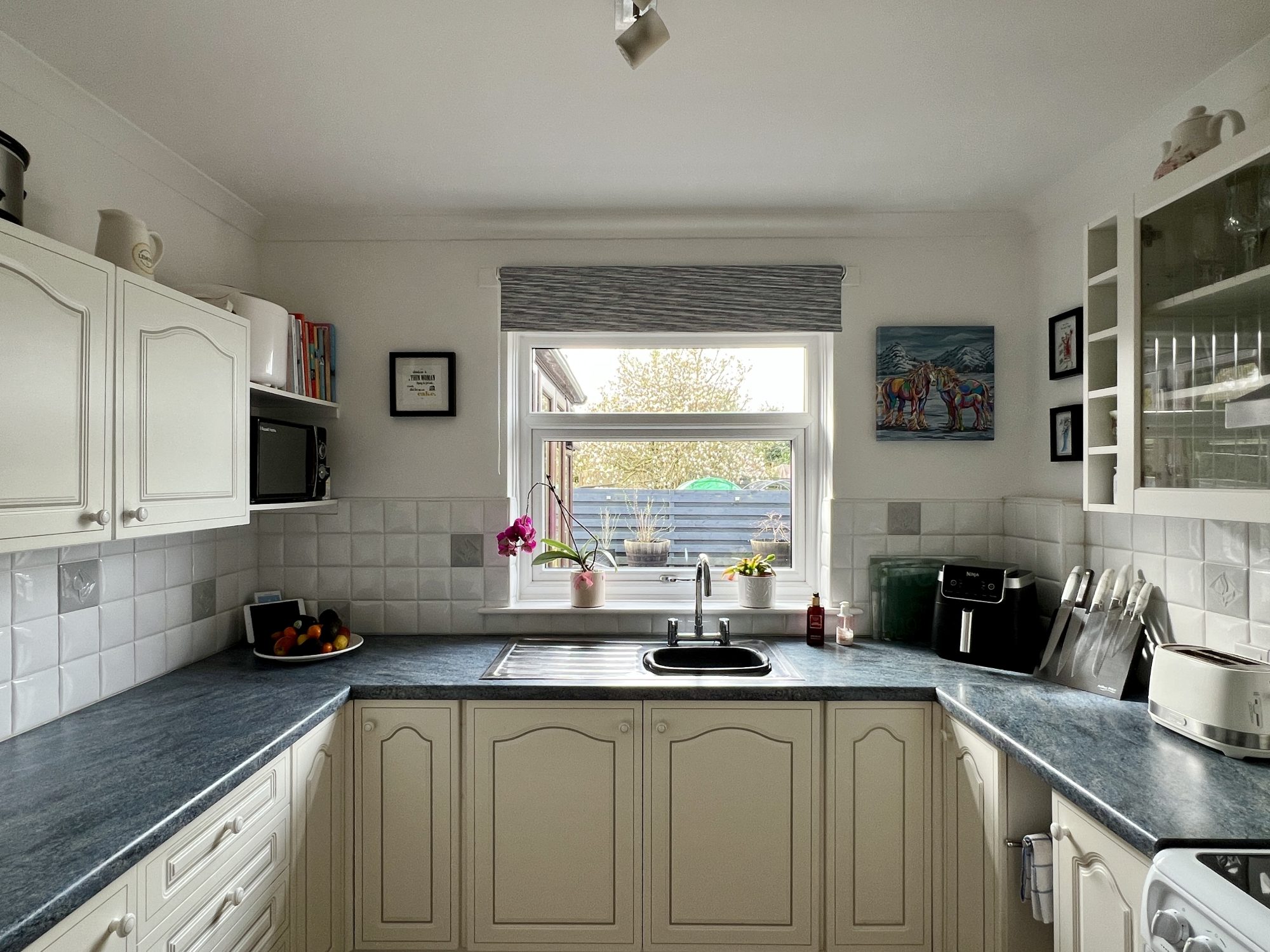 Well positioned bright kitchen with a good range of white fitted kitchen units and laminate work surfaces. Stainless steel sink with mixer tap above. Freestanding electric cooker with stainless steel chimney style extractor hood above. Tiled splash backs. uPVC double glazed picture window to rear with roller blind above. Radiator. Drayton central heating controller. Carbon monoxide detector. Ceiling cornicing. Ceiling light. Wood effect laminate flooring. Door leading through to:-