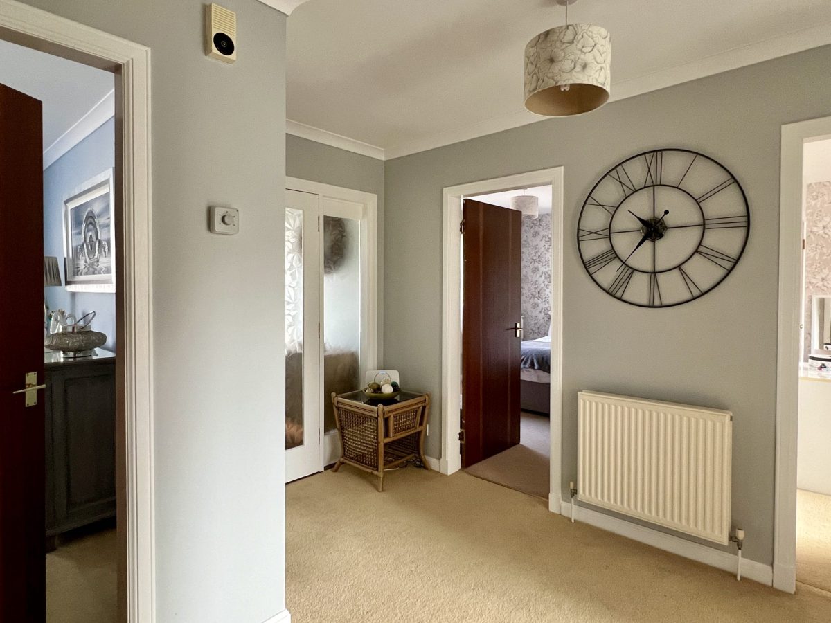 Wide welcoming reception hallway with doors leading off to all ground floor accommodation. Fitted carpet. Radiator. Built in double cupboard with hanging rail and shelving. Central heating thermostat. BT telephone point. Smoke alarm. Ceiling cornicing. Ceiling light.