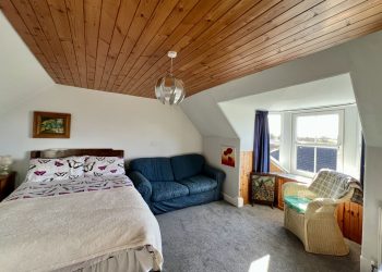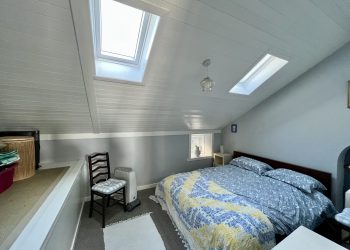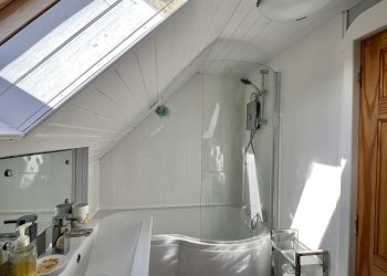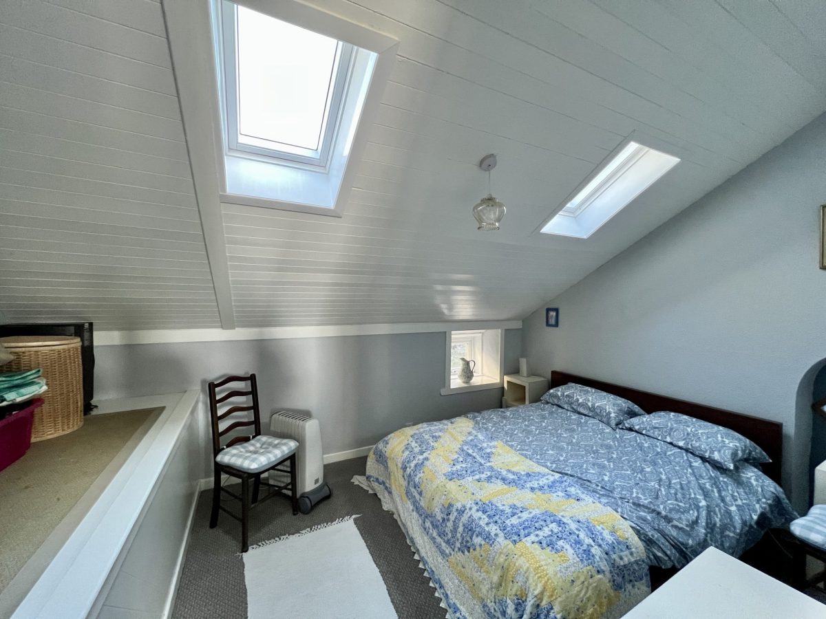 Bright spacious double bedroom with partially coombed ceiling. uPVC double glazed window with deep sill. Two Velux windows. Wood paneled deep shelving to one side. Ceiling light. Fitted carpet.