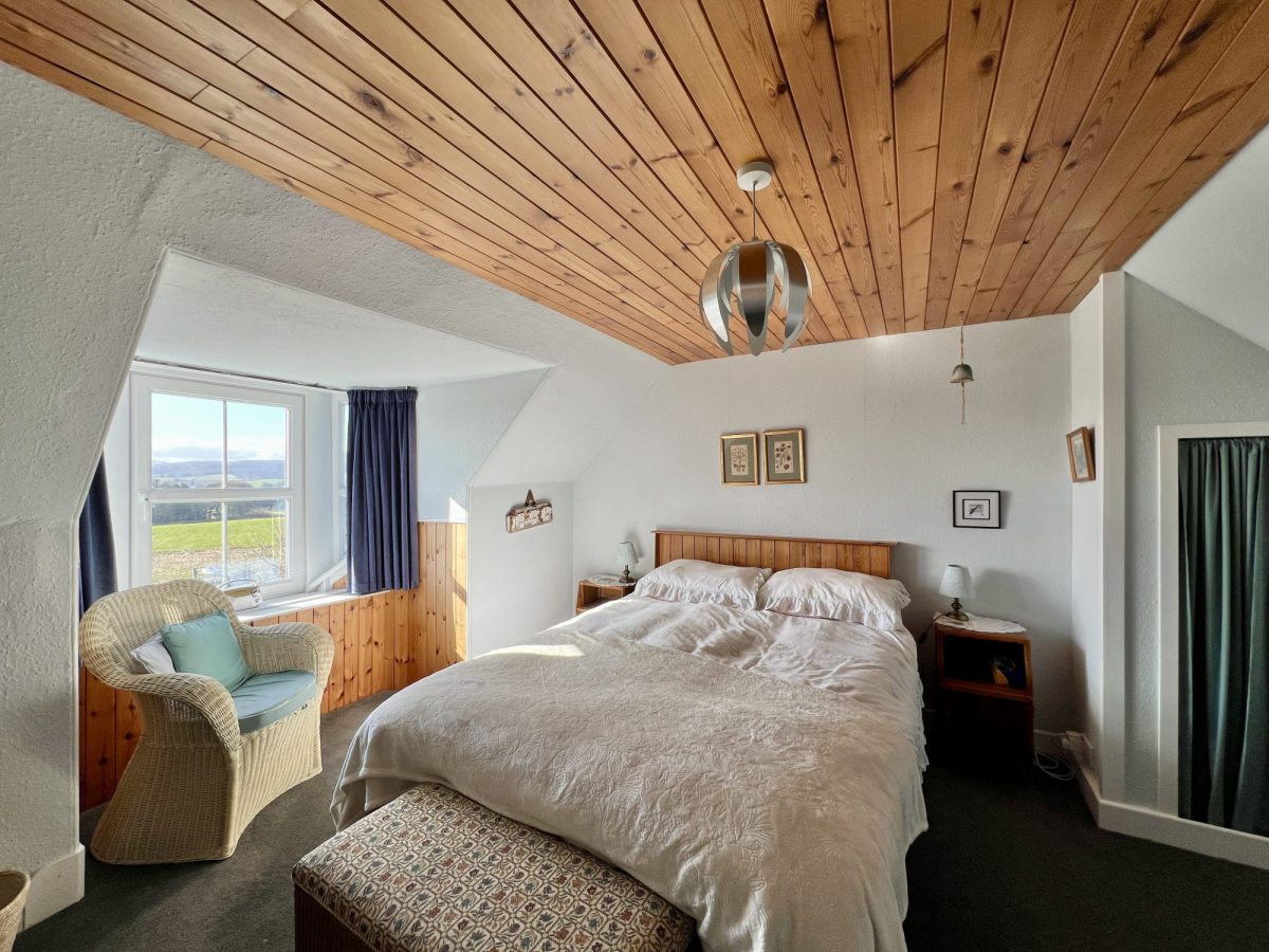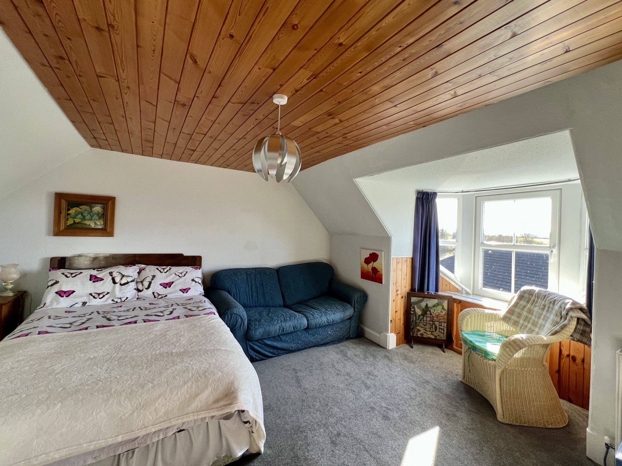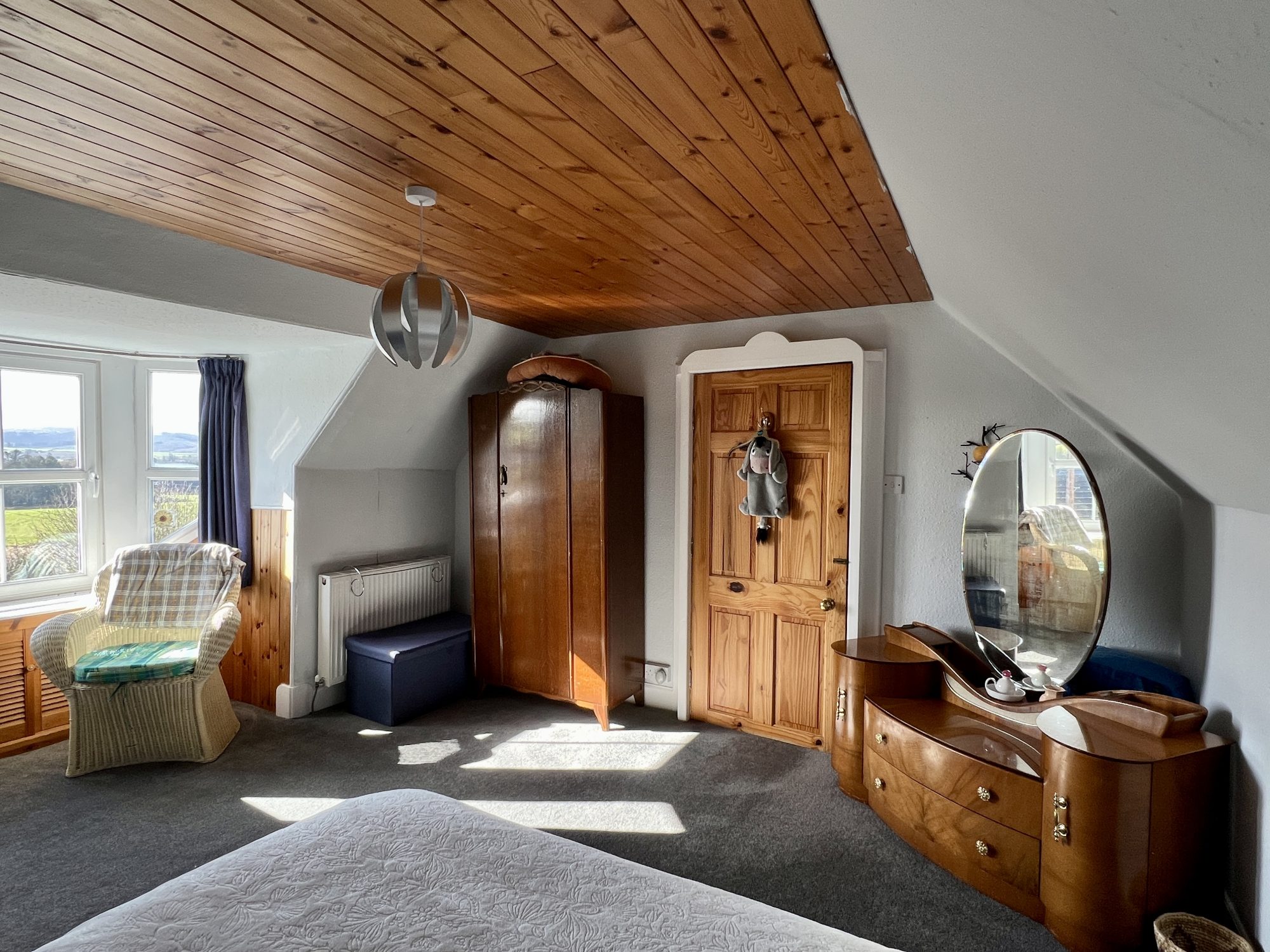 uPVC double glazed window with glazed panels to side with curtain track and curtains. Radiator. Original fireplace. Partially coombed ceiling. Ceiling light. Wood paneled ceiling. Under eaves storage. Fitted carpet.