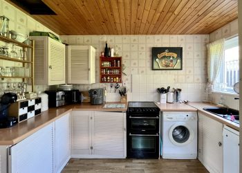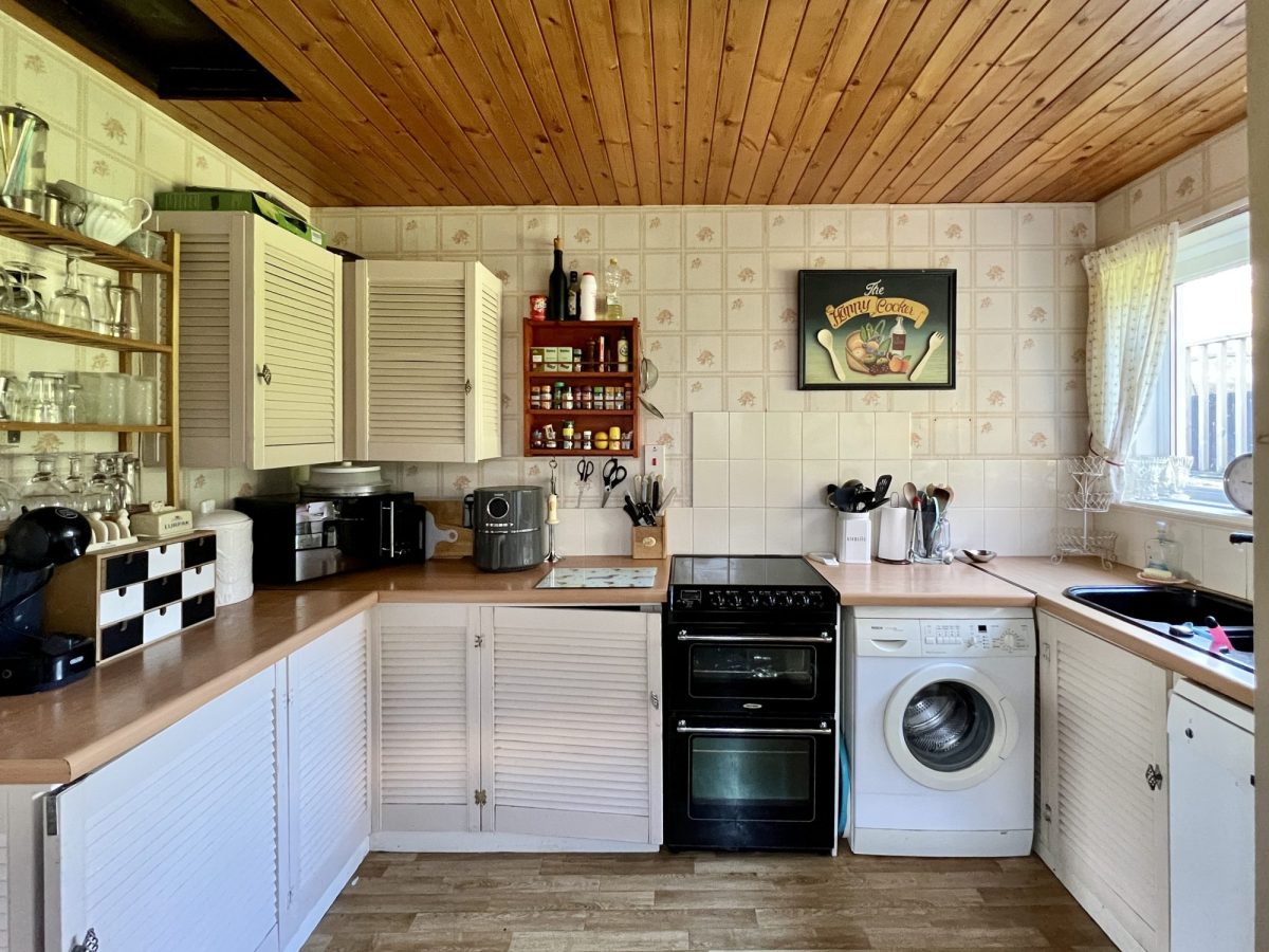 Compact kitchen with a good range of fitted kitchen units. Wood effect laminate work surfaces. Tiled splash backs. Coloured 1 ½ bowl sink with drainer to side. Walk in pantry cupboard with built in shelving. Freestanding fridge freezer. Freestanding electric cooker. Bosch washing machine. Bosch dishwasher. uPVC double glazed window to rear overlooking rear garden with curtain track and curtains above. Dimplex wall mounted heater. Radiator. uPVC obscure glazed door leading out to rear garden. Fluorescent strip light. Wood effect vinyl flooring.