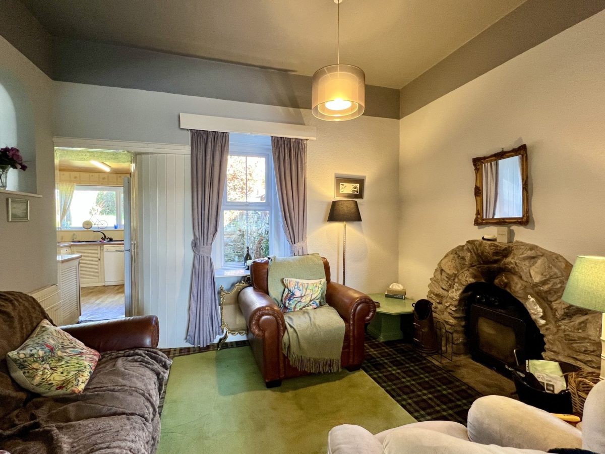 Located to the rear of this open plan area is a good sized sitting room with Stone feature fireplace with cast iron, Clearview, wood burning stove. uPVC double glazed window overlooking rear garden with curtain pole and curtains above. Radiator. Ceiling light. Fitted carpet. Doorway leading into:-