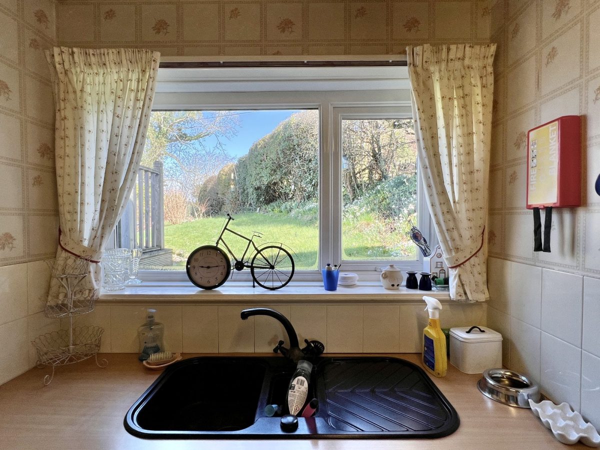 Bright and spacious front facing lounge with an abundance of natural light from three uPVC Georgian style windows with deep sills beneath enjoying a fine view across front garden to the hills beyond. Recessed alcove with built in shelving. Ceiling cornicing. Two ceiling lights. Radiator. Fitted carpet. Wooden door with three steps leading down to:-