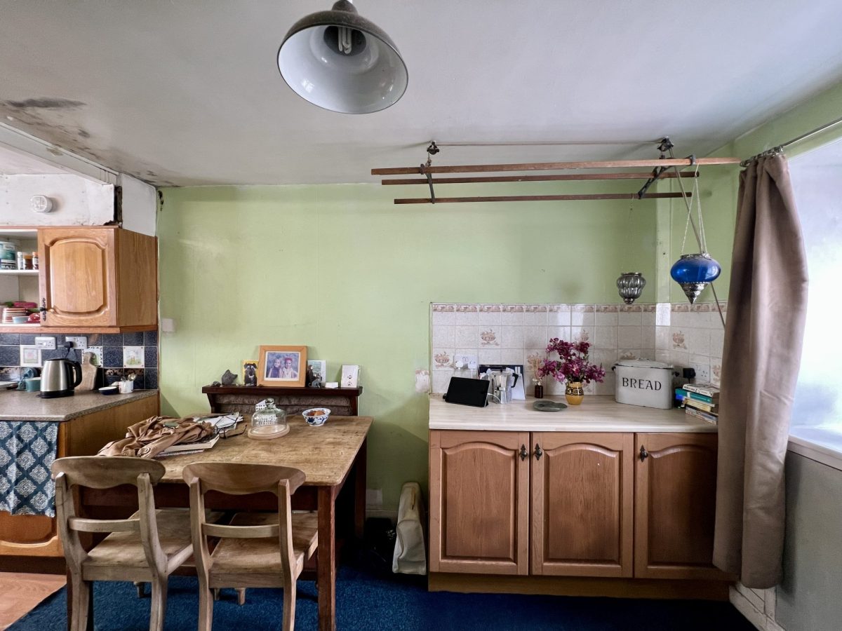 Built in cupboard beneath front facing window providing useful additional storage. Fitted Carpet. Ceiling light. Wooden Clothes Pulley. Fitted Kitchen unit with laminate worksurface providing useful additional storage and preparation space. Radiator. Open fire place with tiled hearth and surround.