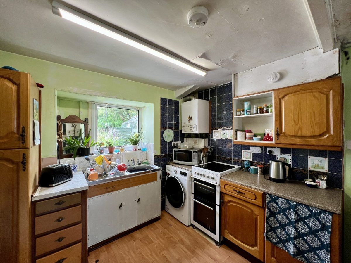 The kitchen area benefits from a good range of fitted kitchen units. Stainless steel sink with drainer to side. Tiled splash-backs. Plumbing for washing machine. Two built-in storage cupboards and further pantry cupboard. Wall mounted boiler. Freestanding electric cooker. Radiator. Laminate flooring. Fluorescent strip light. Smoke alarm.
