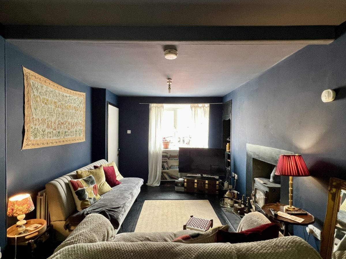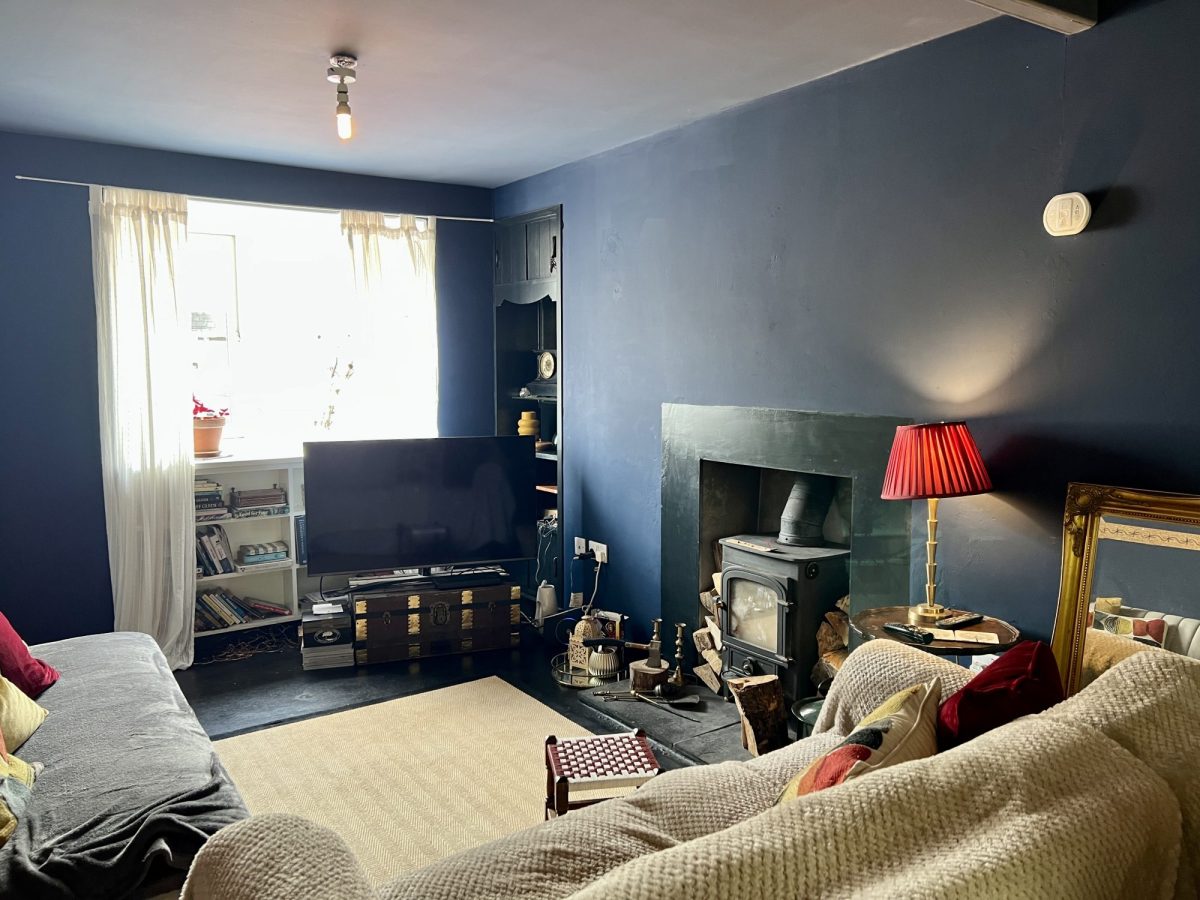 Bright front facing reception room running the full depth of the original cottage with UPVC double glazed window to front and uPVC double glazed window to rear. Curtain pole and curtains above. Inglenook fireplace with inset cast iron wood burning stove. Recessed alcove with shelving. TV aerial point. Radiator. Doorways leading off to reception hall and rear inner hall.