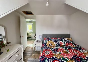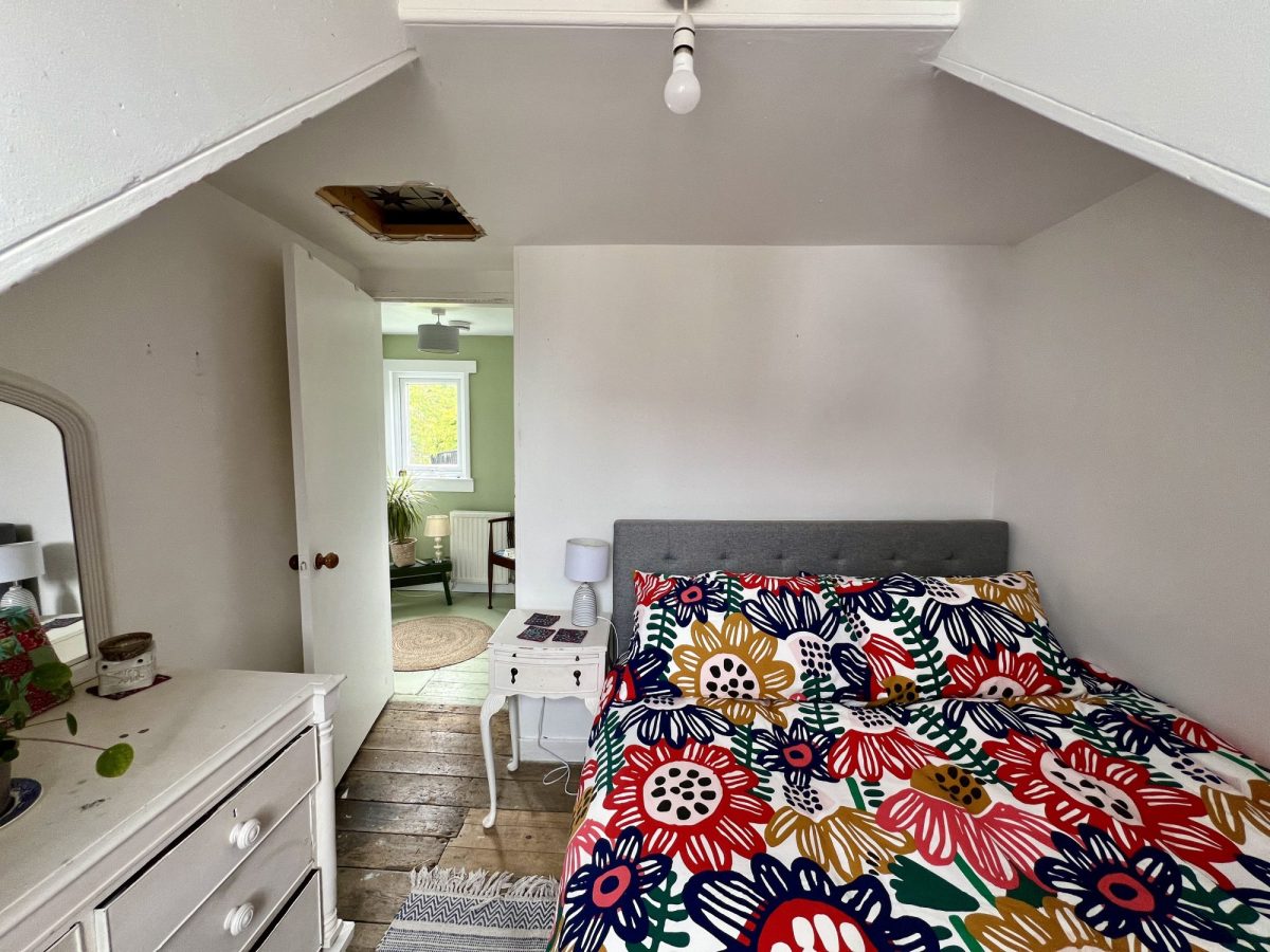 With ample natural light from front facing window. Under-eave storage area. Stripped wooden floorboards. Ceiling light.