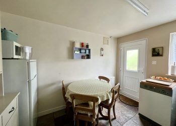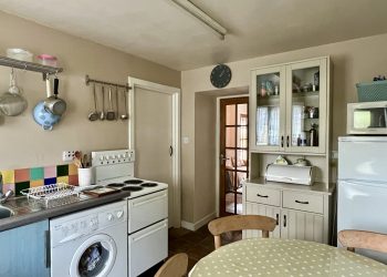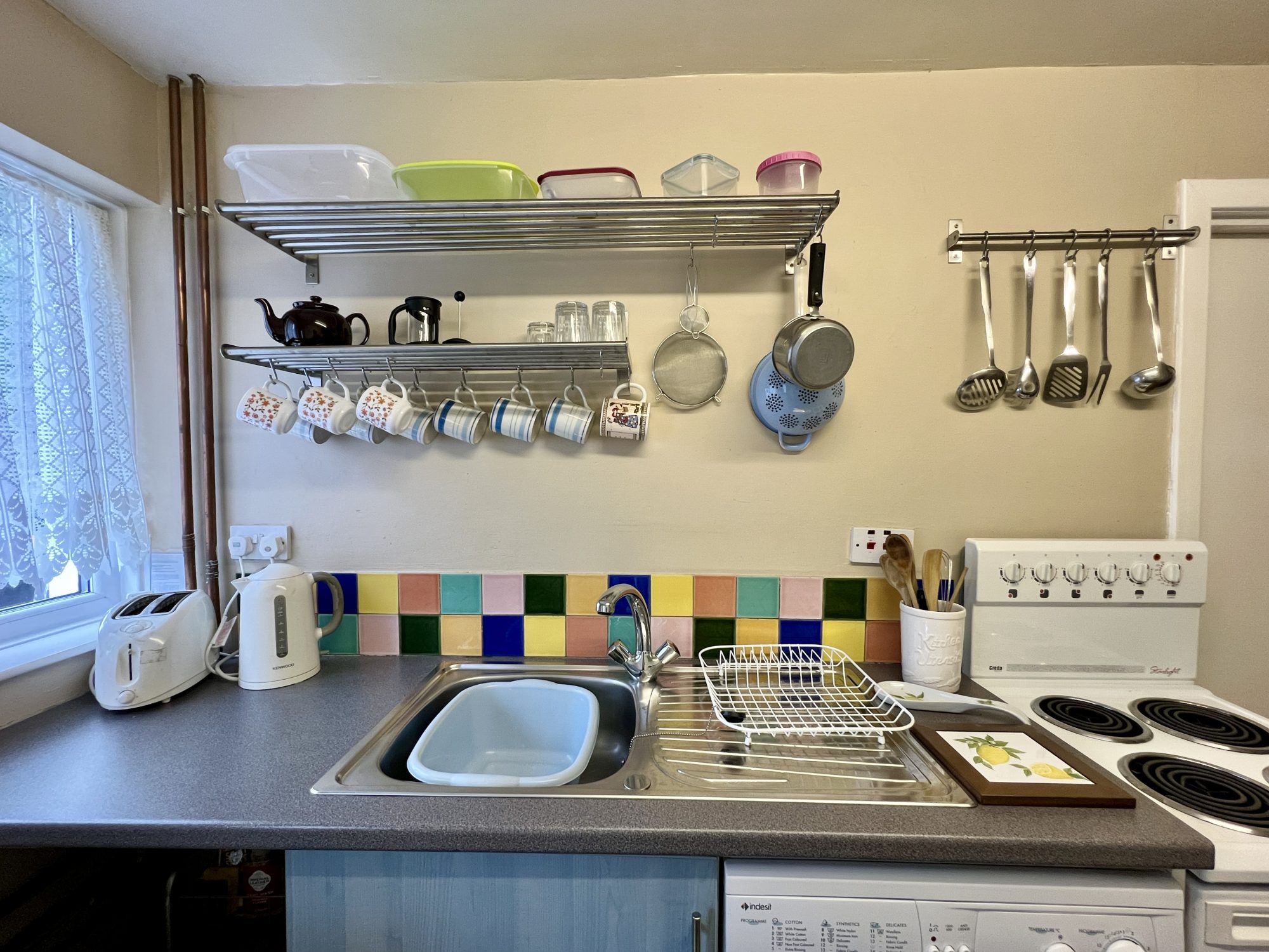Located to the rear of the property is a well-positioned kitchen with double glazed window to rear. UPVC double glazed door leading out to rear garden. Fluorescent strip light. Freestanding shaker style dresser. Radiator. Fridge Freezer. Extractor fan. Oil fired boiler. Stainless steel sink with mixer tap above and drainer to side and cupboard beneath and laminate work surfaces to side. Washing machine. Freestanding Electric cooker. Wall mounted stainless steel shelving and pan rack. Natural slate tiled floor. Doorway leading to:-