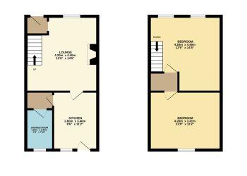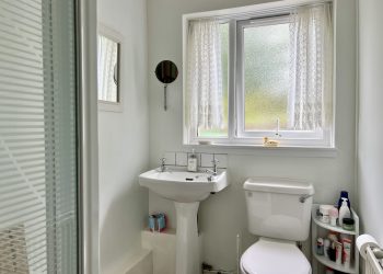 Suite of white wash hand basin and WC with tiled splash backs. Radiator. UPVC double glazed window to rear. Shower cubicle with electric shower above and tiled splash backs. Wall mounted halogen heater. Ceiling light. Extractor fan. Natural slate tiled floor.