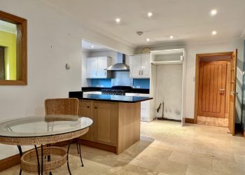 Fitted kitchen units with laminate work surfaces. Ceiling cornicing. Ceiling light. uPVC double glazed door with double glazed window to side leading out to garden. Slate effect tiled floor.