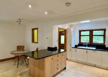 Spacious kitchen diner ideal for modern family living with ample room for dining. Fitted shaker style units with granite work surfaces. Central Island and breakfast bar area with granite work surface. Internal glazed window into utility room. Ceiling light. Kitchen benefits from ceramic 1 ½ bowl sink with mixer tap and drainer to side. Integrated dishwasher. Freestanding Rangemaster gas fired cooker with stainless steel chimney style extractor hood above. Wood effect uPVC double glazed windows to rear. Velux window. Ceramic tiled floor. Recessed LED ceiling spotlights. Ceiling cornicing Doorway leading into:-