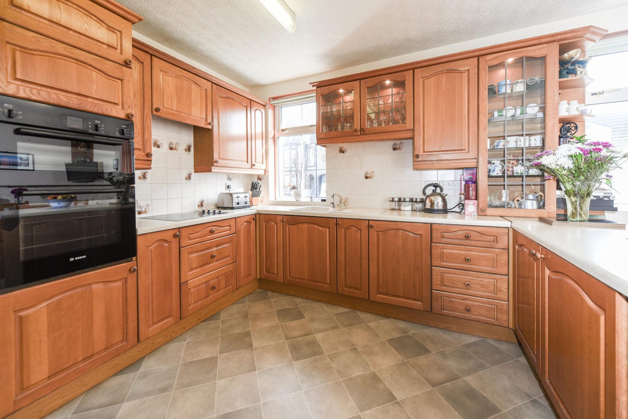 Built in cabinets with Stainless steel 1 ½ bowl sink with mixer tap and drainer. Laminate work surfaces. Tiled splash backs. Wooden clothes pulley. Built in cupboard. UPVC double glazed tilt and turn window to front with roller blind. Radiator. Stanley oil range cooker (which is currently disconnected). Serving hatch. Bosch dishwasher. 2 Fluorescent strip lights. Carpet. Archway through into formal