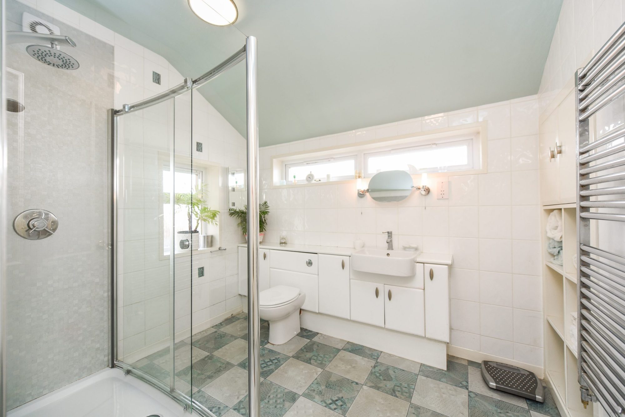 Chrome heated towel rail. Electric shaver point. Fitted mirror. Vinyl flooring.