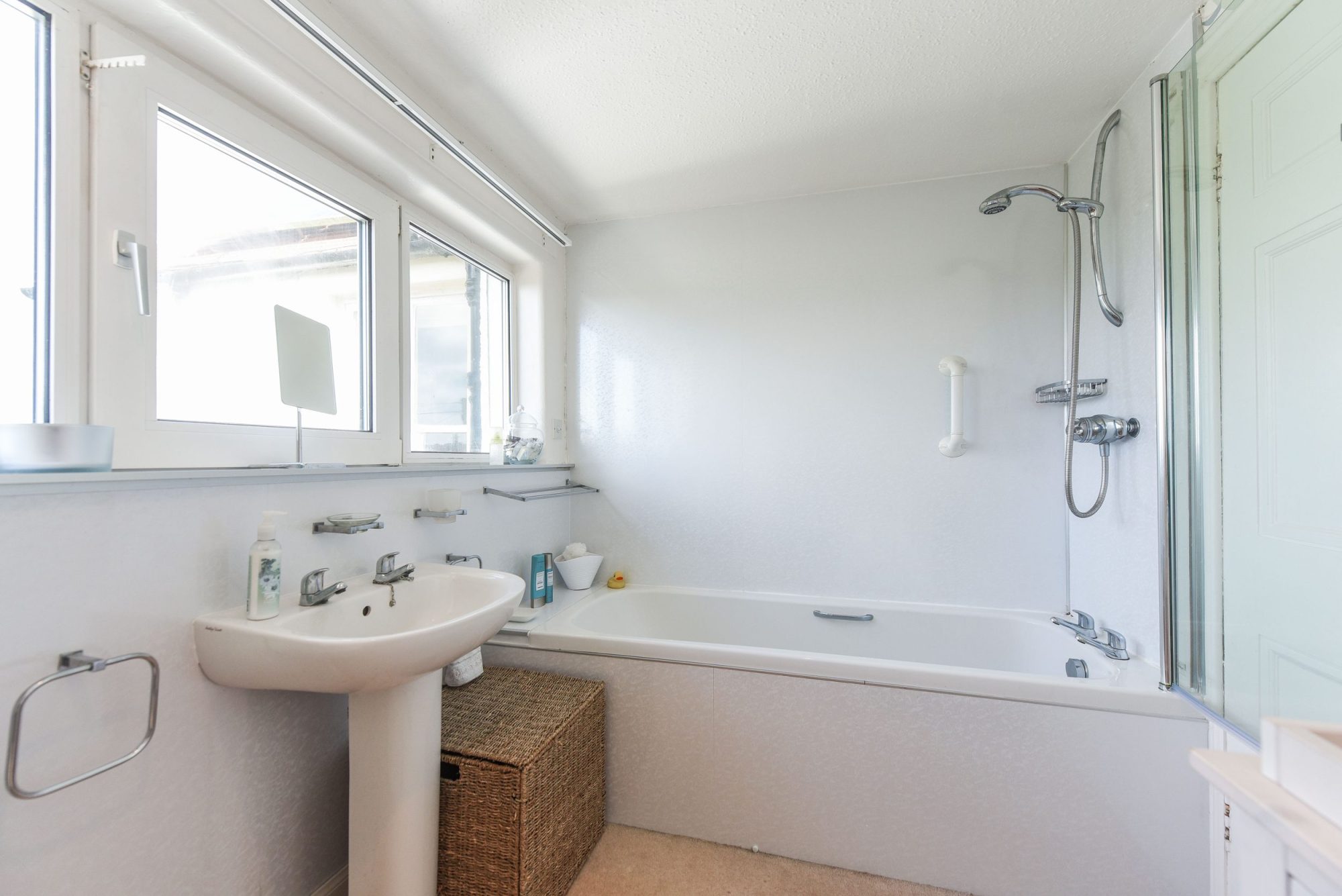 Good sized family bathroom with suite of white wash hand basin, W.C. and bath. uPVC double glazed picture window to rear with