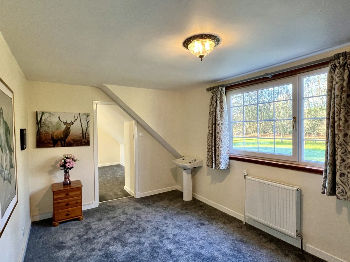 uPVC double glazed window to rear with curtain pole and curtains. Radiator. White wash hand basin. Partially coombed ceiling. Ceiling light. Fitted carpet. Doorway leading into:-
