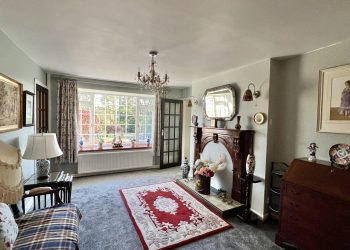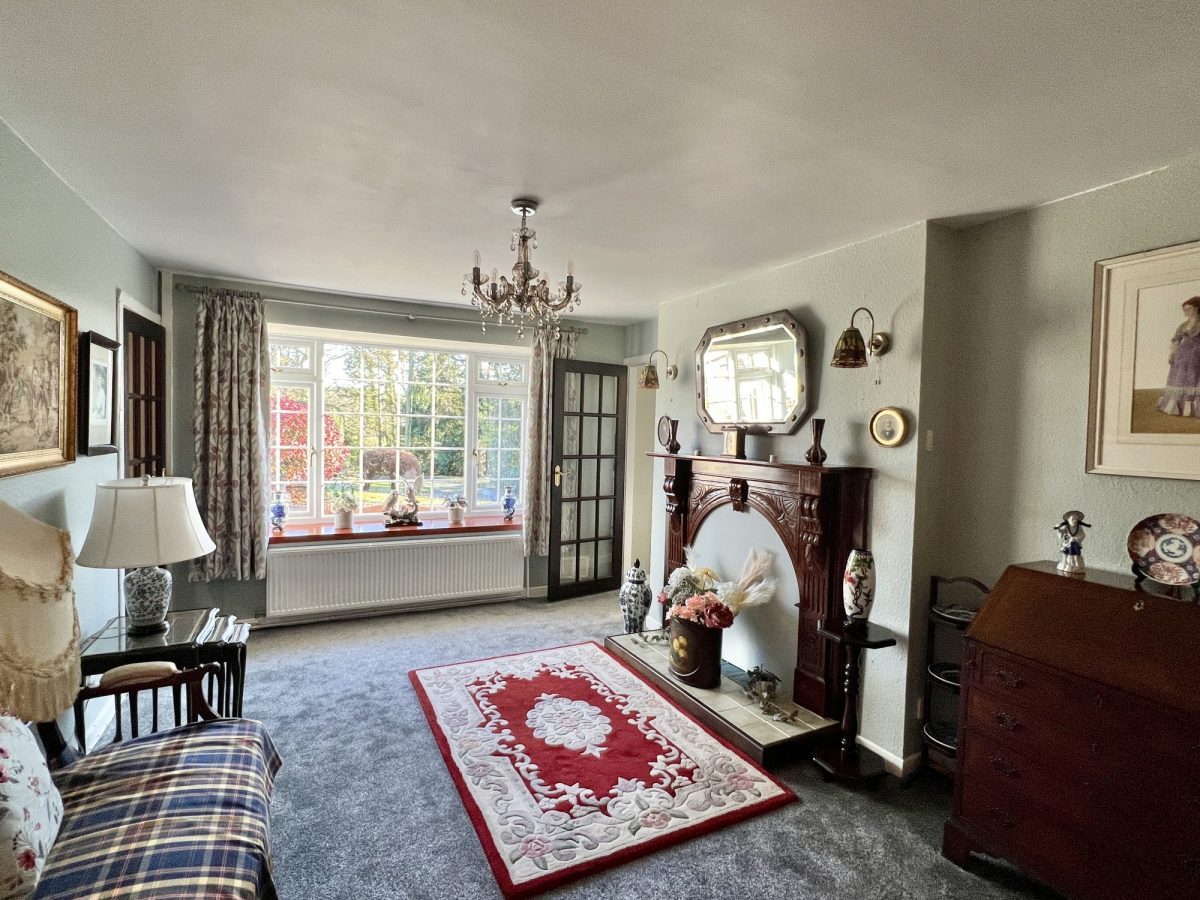 Front facing reception room. Ceiling light. 2 wall lights. Smoke alarm. Fireplace with tiled hearth, wooden surround and mantel. Large uPVC double glazed window to front overlooking garden with deep sill beneath, curtain pole and curtains. Radiator. Fitted carpet. 15 pane glazed door leading into kitchen with a further 15 pane glazed door at the rear of the sitting room leading into dining room/bedroom 1.