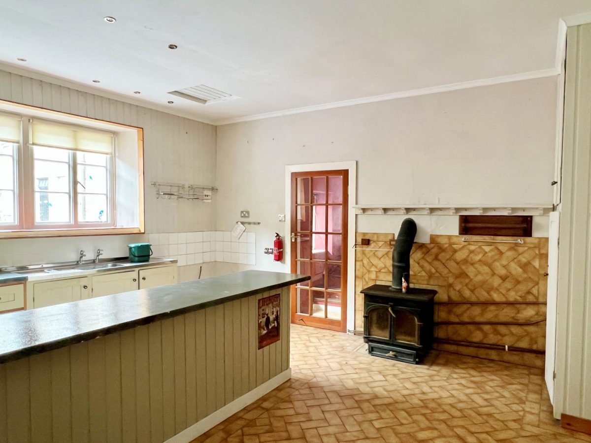 Entered through 15 pane wooden glazed door into spacious farmhouse style kitchen / dining room with a good range of bespoke solid wooden kitchen cupboards. Stainless steel sink with drainers to both sides. Tiled splash backs. Wood panelling on one wall to ceiling and other wall to waist height. Cast iron multi-fuel stove with shelving above. Wooden floor to ceiling cupboards with built-in shelving. Wall light. Recessed ceiling spotlights. 2 further spotlights. Loft access hatch. Two steps lead up to:-