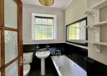 Suite of white wash-hand basin, W.C. and bath. Respatex style wall panelling to waist height. Chrome heated towel rail. Fixed bathroom cabinet. Obscure glazed sash and case window to rear with roller blind above. Flagstone floor.