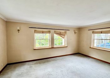 Fitted carpet. Wood panelling on one wall. Sash and case window with Roman blind above. Ceiling light.