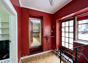 Wooden single glazed window to front with roman blind above. Wooden staircase with wrought iron handrail leading up to first floor level. Radiator. Doors leading off to walk-in storage room/larder, bathroom. Fixed wooden shelving. Ceiling light. Ceiling cornicing. Ceramic tiled floor. Two steps lead up to:-