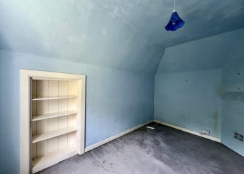 Sash and case window. Curtain track. Recessed shelved alcove. Electric panel heater. Ceiling light. Partially coombed ceiling. Fitted Carpet.